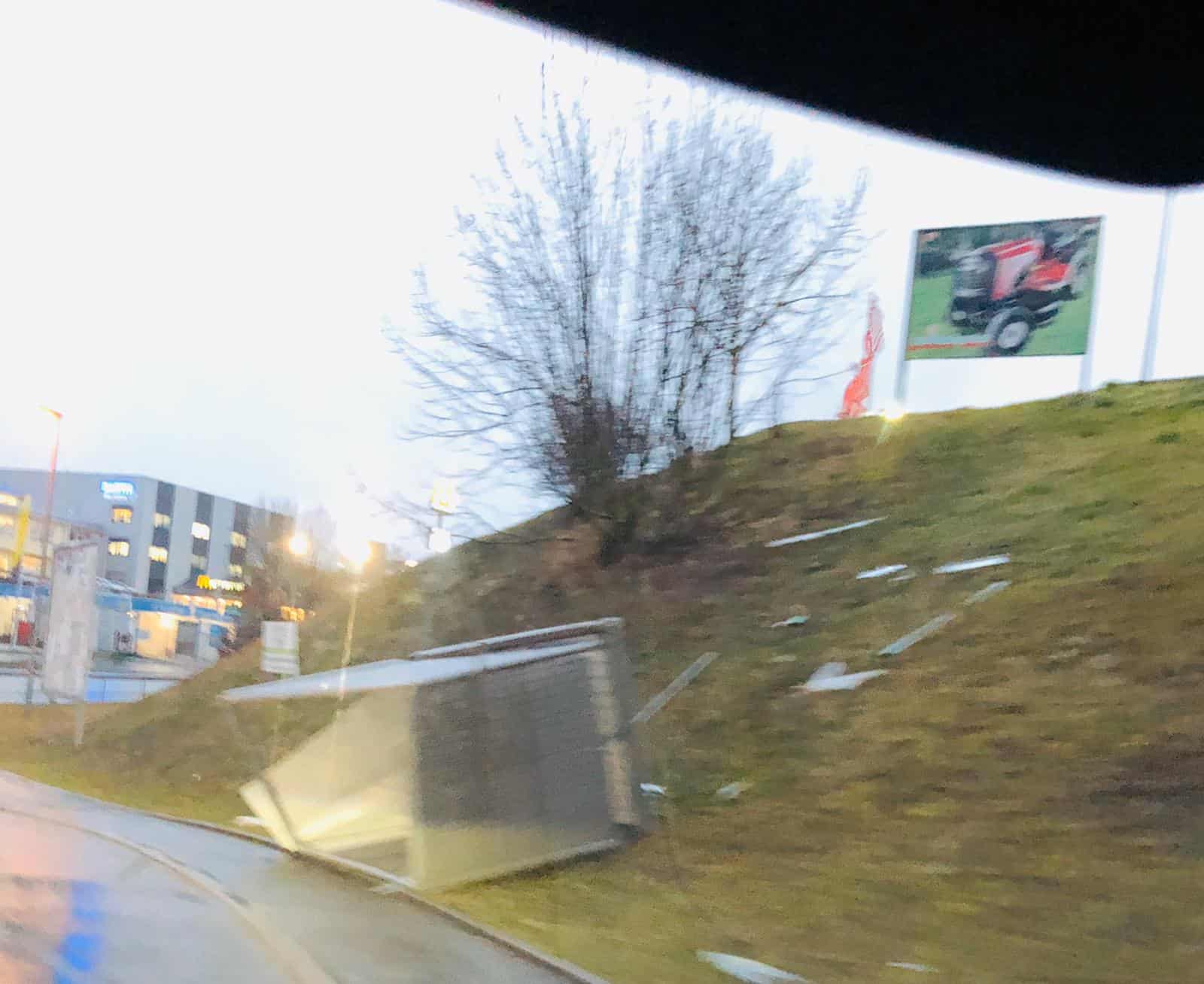 Ein Verkehrszeichen in Zimmern ob Rottweil am Kreisverkehr in der Römerallee hatte sich mitsamt der Verankerung aus dem aufgeweichten Boden gelöst und ragte auf die Straße. Eine weggewehte Zaunrolle gefährdete um Mitternacht kurzzeitig den Verkehr auf der B27 zwischen Rottweil und Neukirch.
