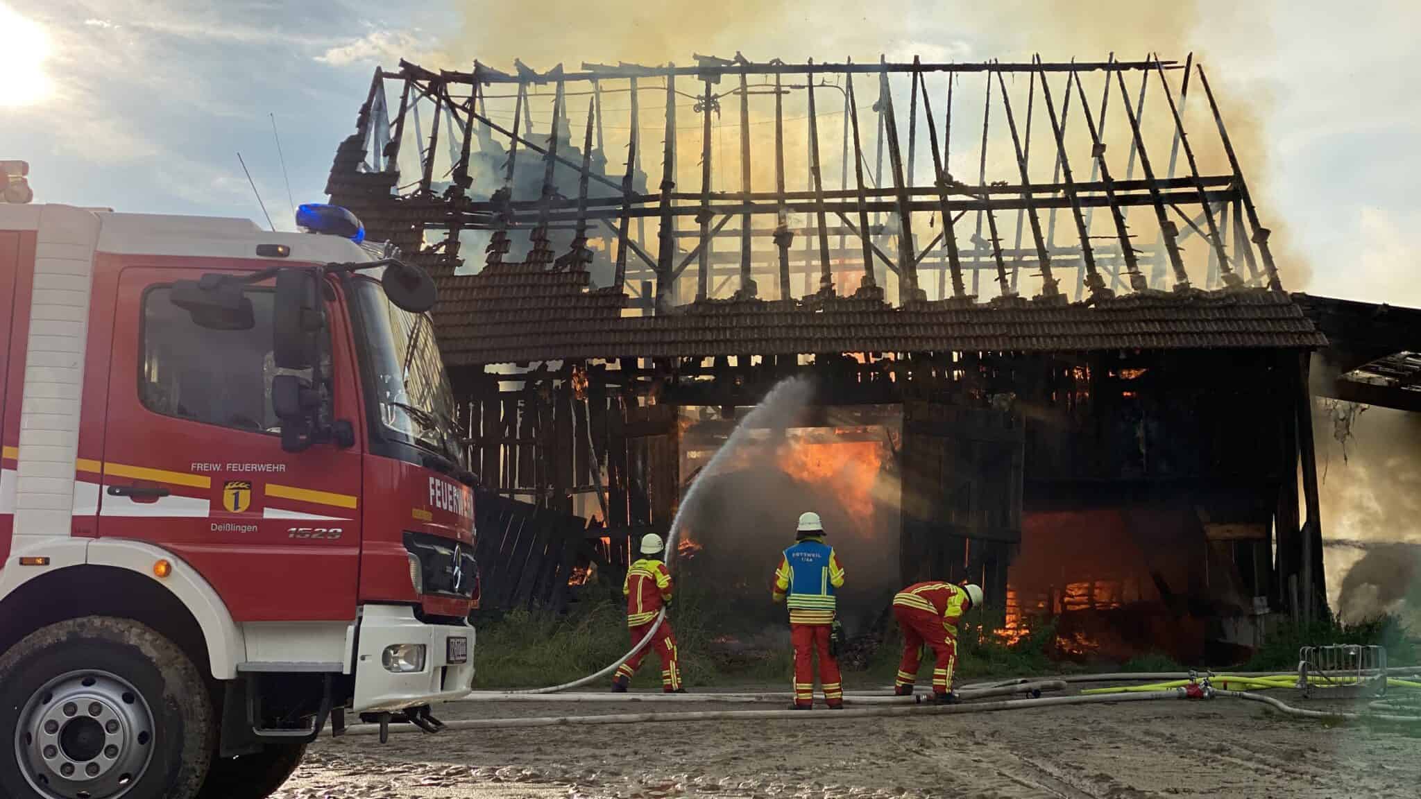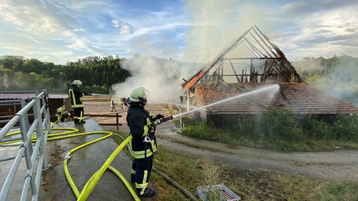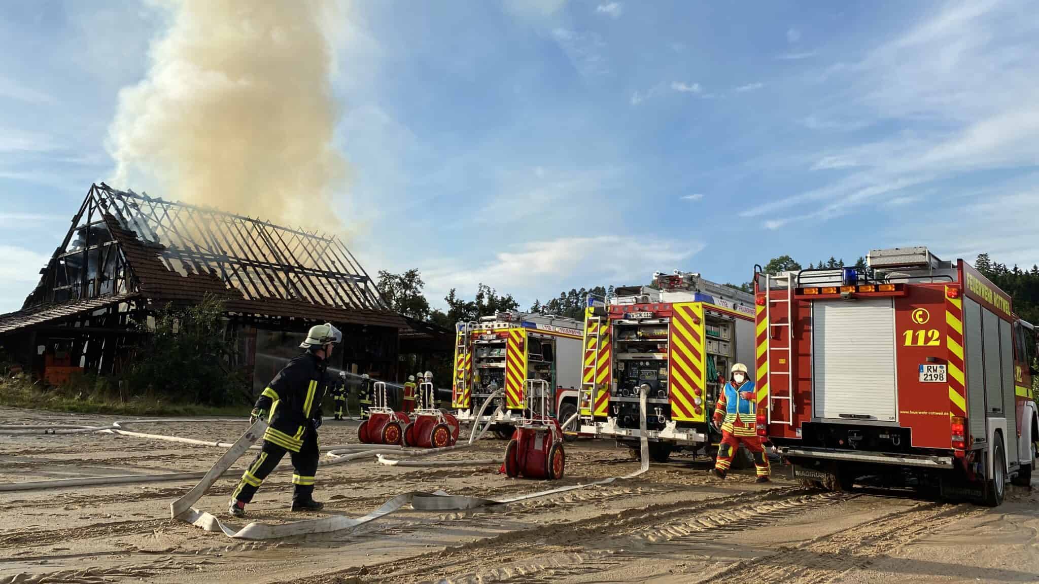 Auf dem Hofgut Unterrotenstein, einem Reitsporthof zwischen Hausen und Deißlingen, ist am Montagabend ein Feuer in einer Scheune ausgebrochen. Die Wehren aus Rottweil und Deißlingen waren im Großeinsatz mit zunächst rund 60 Kräften, später mehr. Zudem das Rote Kreuz mit vielen Ehrenamtlichen, die sich vor allem um die Verpflegung kümmerten. Das THW aus Trossingen und Rottweil ist nachalarmiert worden. Die Löscharbeiten dauerten viele Stunden an. Zwischenzeitlich war die Rauchentwicklung so stark, dass sich die Kräfte zurückziehen mussten. Ursache für das Feuer laut Polizei: ein Blitzeinschlag. Den Schaden schätzt sie auf 50.000 Euro.