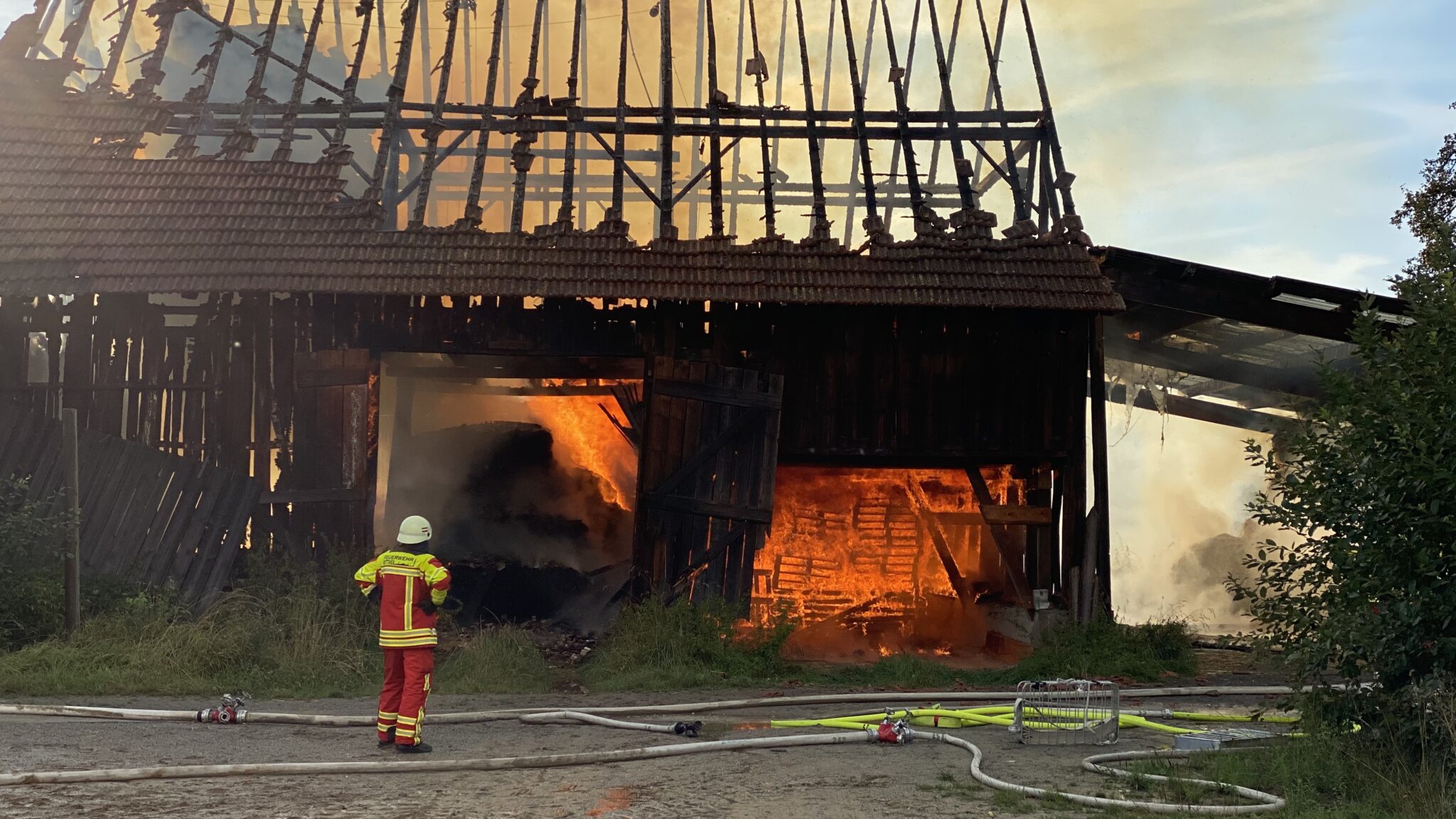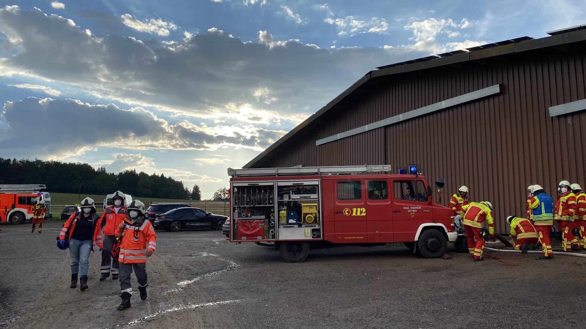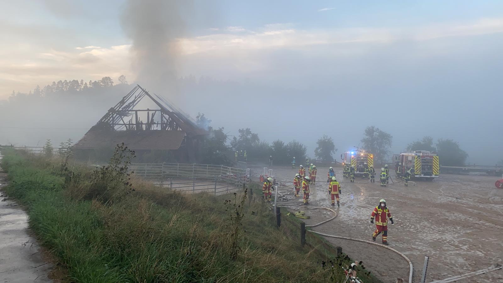 Das Feuer betraf das Reitsportzentrum Red Stone Ranch am Unterrotenstein, die zu Hausen gehört. In der Scheune war vor allem Stroh gelagert. Menschen oder Tiere waren zunächst nicht in Gefahr. Doch steht in unmittelbarer Nachbarschaft der Stall des Hofguts. Mitarbeiterinnen kümmerten sich um die darin untergestellten Pferde.