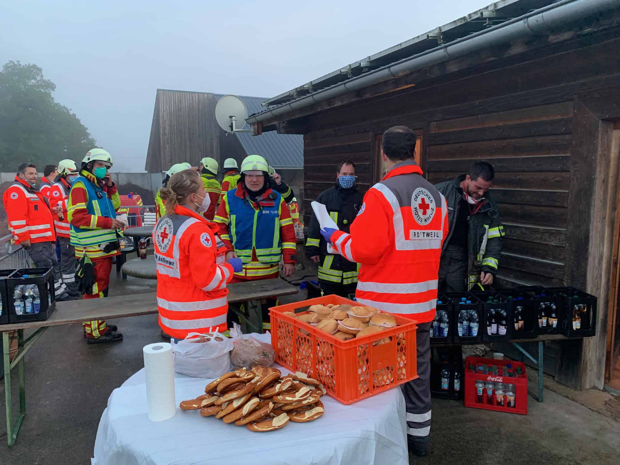 Die Erfahrung der beiden Feuerwehr-Kommandanten über die Dauer solcher „Brand in Scheune mit Stroh bestückt“-Einsätze sowie die erwähnte Uhrzeit ließen bei der DRK-Einsatzleitung – gewissermaßen ab Eintreffen – diese Verpflegungs-Aktivität starten. „Der kurze Weg nach Deißlingen, die guten örtlichen Kenntnisse waren von Vorteil – wie kann man nach 19 Uhr noch viele Getränke erhalten, ist der örtliche Metzger erreichbar, wo gibt es Brot, wie ist es am einfachsten, unter den gängigen Hygienebestimmungen die Brötchen zu bestücken“, so der Kreisbereitschaftsleiter. „Es ist einfach wunderbar, wenn die örtlichen Helfer – bestens vernetzt – sich austauschen, Freunde und Bekannte erreichen und dann gemeinsam das „Abendessen“ organisiert wird“, berichtet Häring.