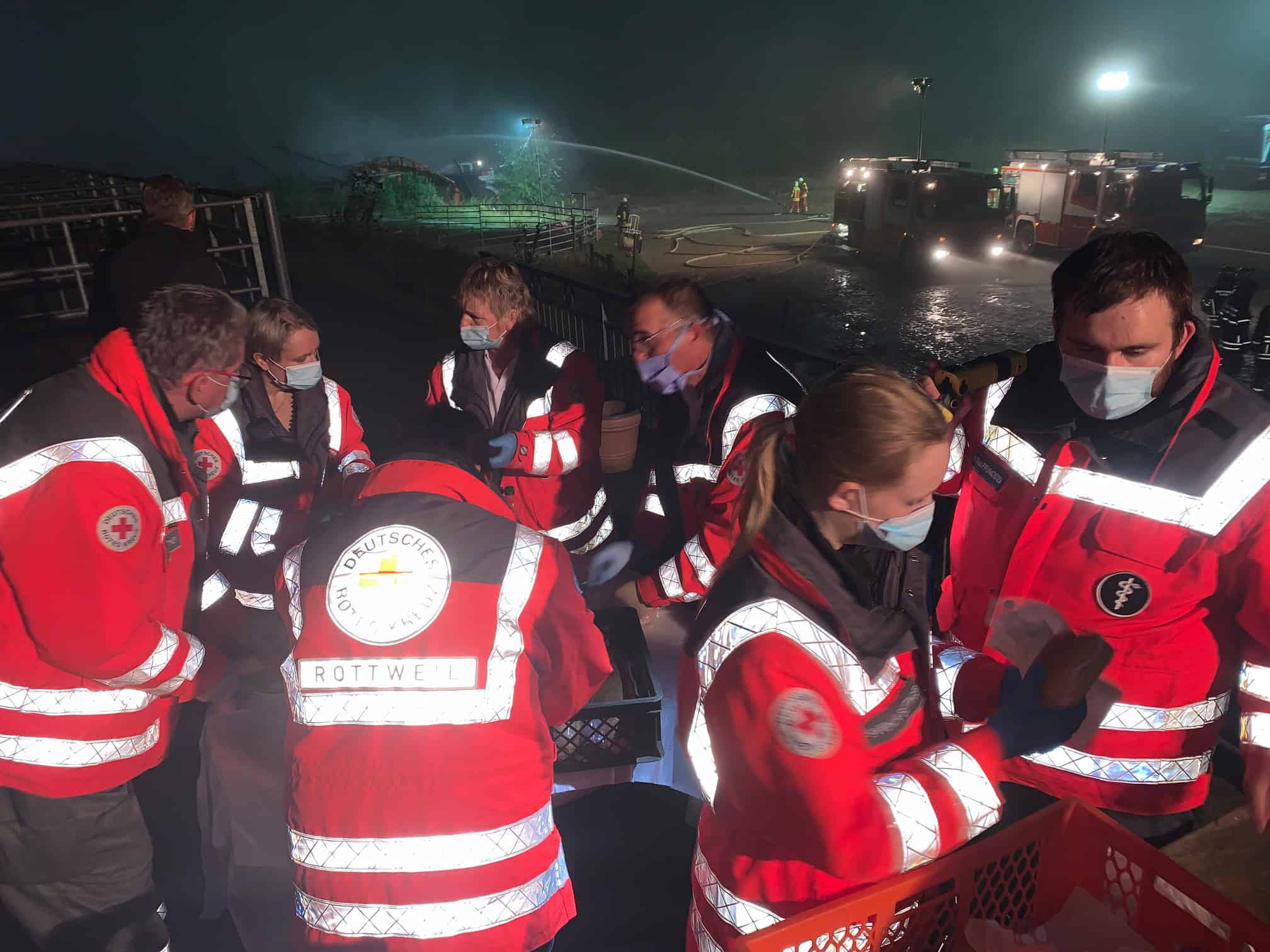 Häring berichtet: „Weil kurz nach 18.30 Uhr der Alarm kam, hatten viele FFW Kameraden – üblicherweise – noch kein vollständiges Abendessen zu sich genommen. Deshalb war die Versorgung der Helferinnen und Helfer mit Getränken und Verpflegung eine wesentliche Aufgabe der ehrenamtlichen DRK-Kräfte.“