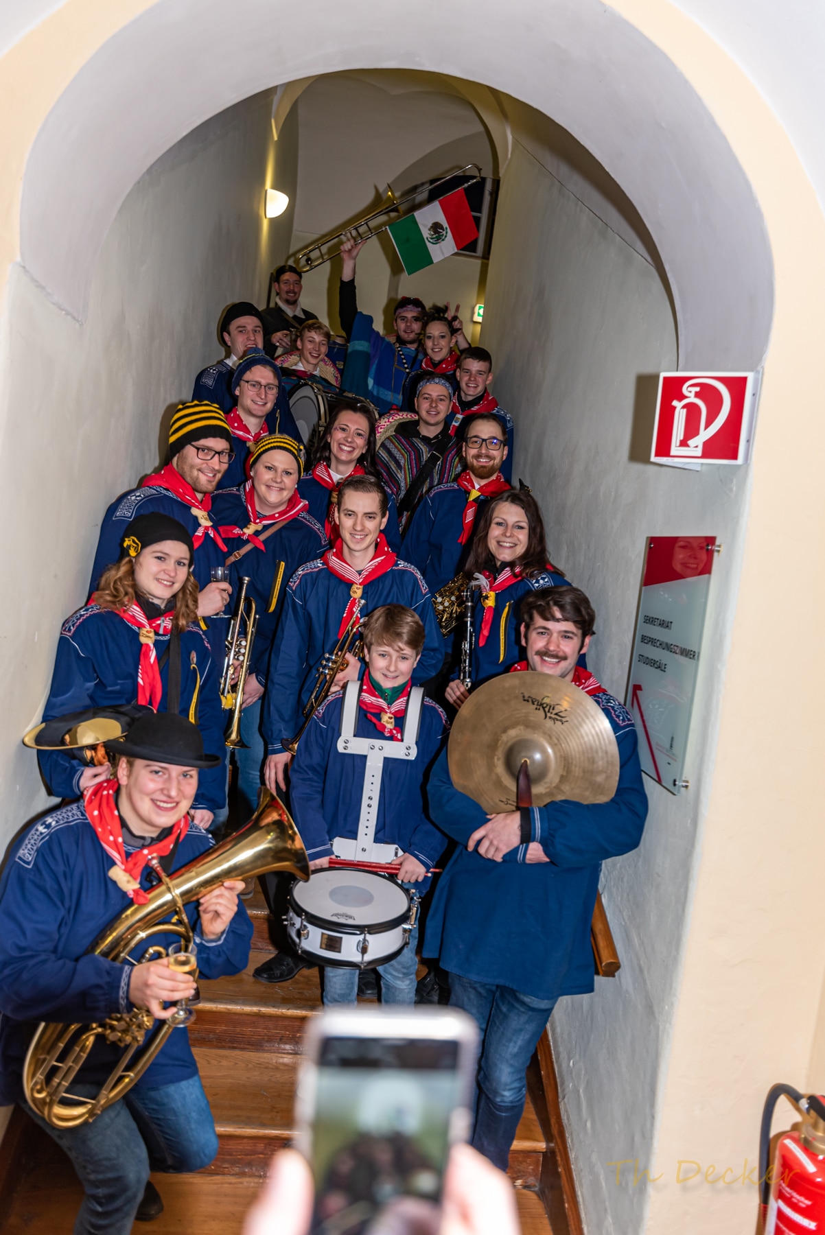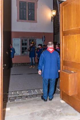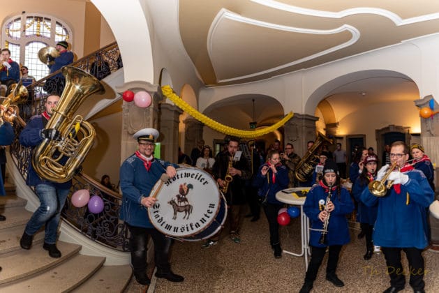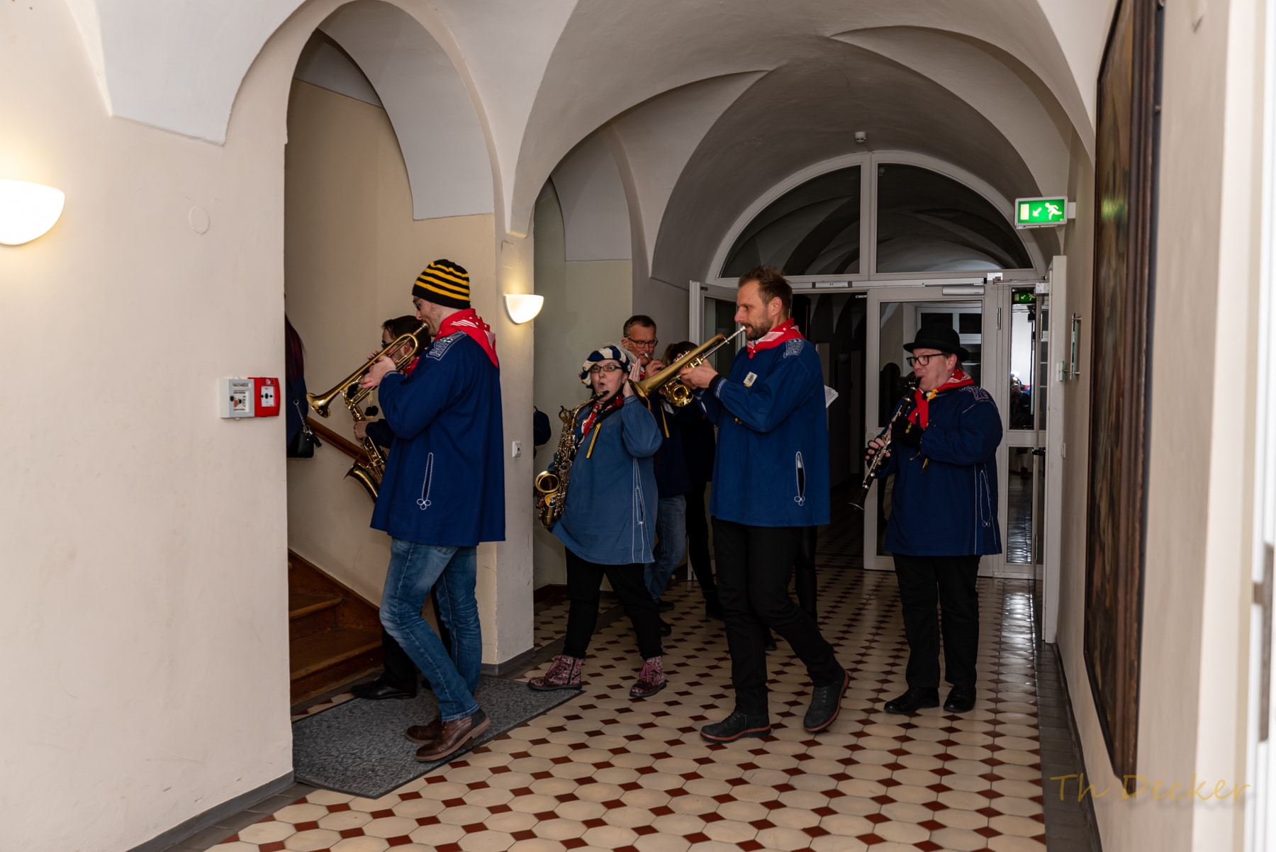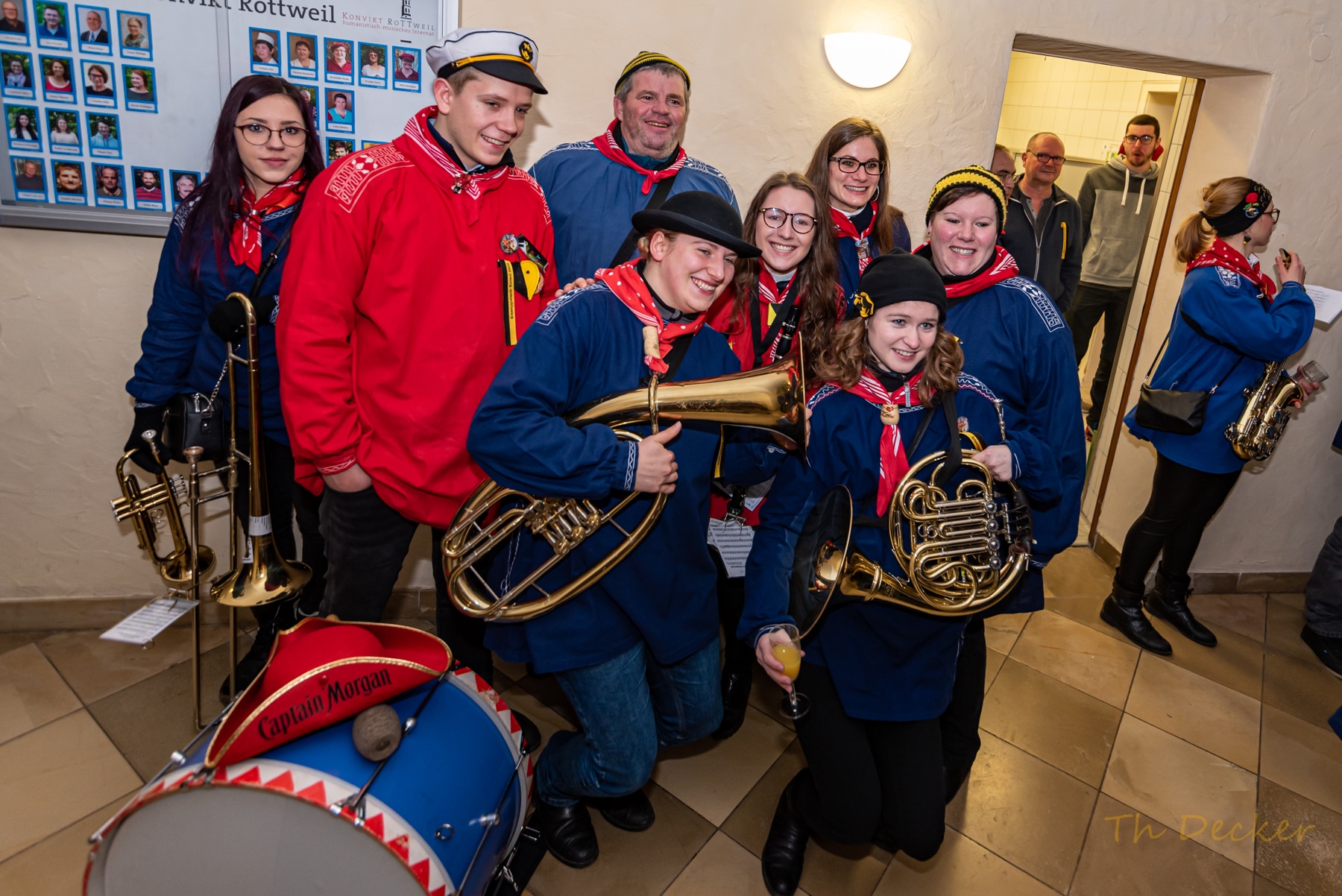 Die Fasnet, die fünfte Jahreszeit hat in Rottweil begonnen. Mit der Schmotzigenkapelle – aktuell mit ‚zig Musikern riesig besetzt – und dem Rottweiler Narrenmarsch. Mit diesem sind sie am Morgen gegen 6 Uhr schon ins Konvikt eingezogen, freudig erwartet und begrüßt von Pfarrer Jürgen Rieger.