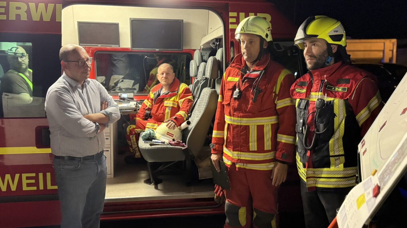 Rottweils Oberbürgermeister Dr. Christian Ruf eilte ebenfalls an die Einsatzstelle, ließ sich direkt vom stellvertretenden Stadtbrandmeister Markus Würtemberger und dem Leiter der Führungsgruppe, Thomas Probst, am Wagen der Einsatzleitung über den Stand informieren. Er erfuhr etwa, wie schnell die Feuerwehr eingegriffen hat: Der Alarm kam gegen 23.09 Uhr, eine gute halbe Stunde später war das Feuer aus.
