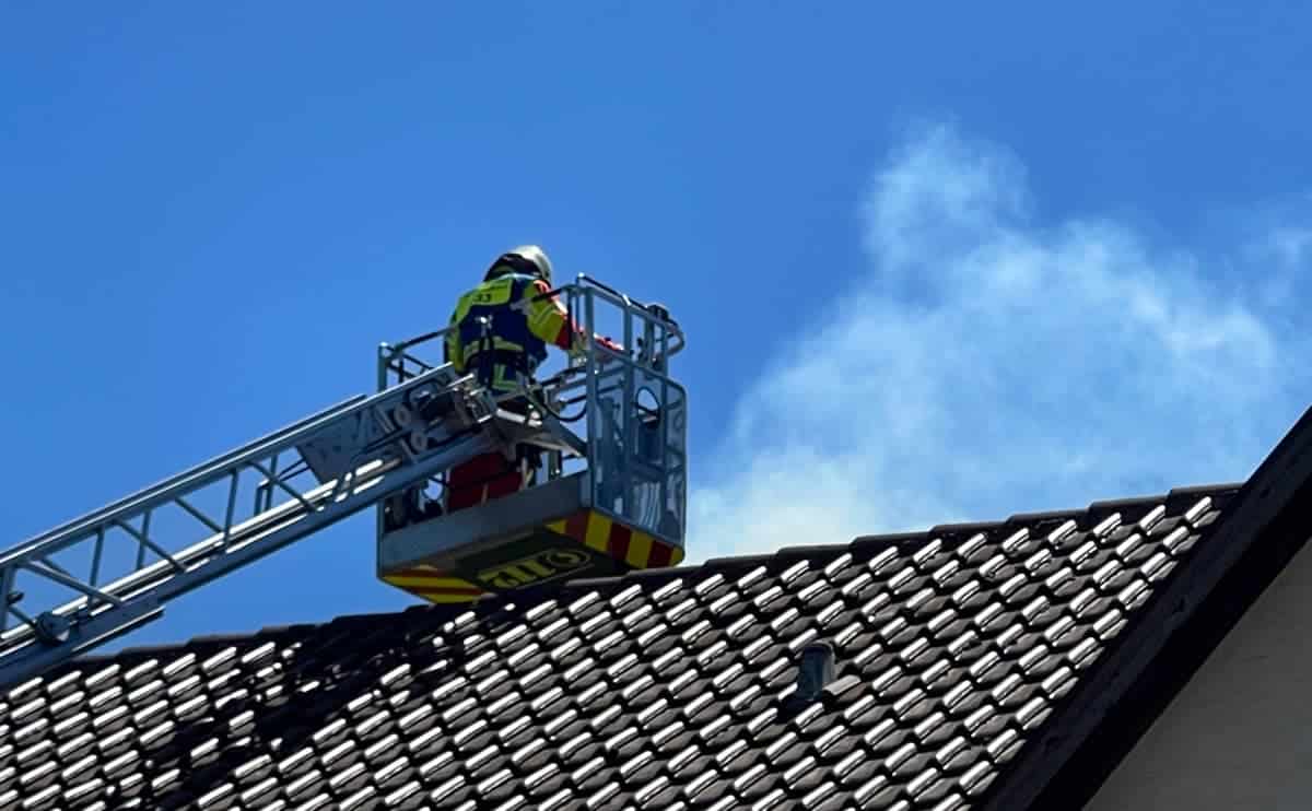 Die Feuerwehr rückte dem Brand von innen wie von außen zu Leibe. Während Einsatzkräfte unter Atemschutz den Kamin im Keller des Gebäudes ausräumten, machte sich ein Feuerwehrmann auf den Weg durch ein Dachflächenfenster aufs Dach, um die Lage von oben zu begutachten. Zusätzlich kam ein Kamerad hinzu, um vom Korb der ausgefahrenen Drehleiter aus ein Gewicht in den Kamin abzulassen, diesen auf diese Weise freizuräumen. Rauchende Glut wurde ins Freie gebracht.