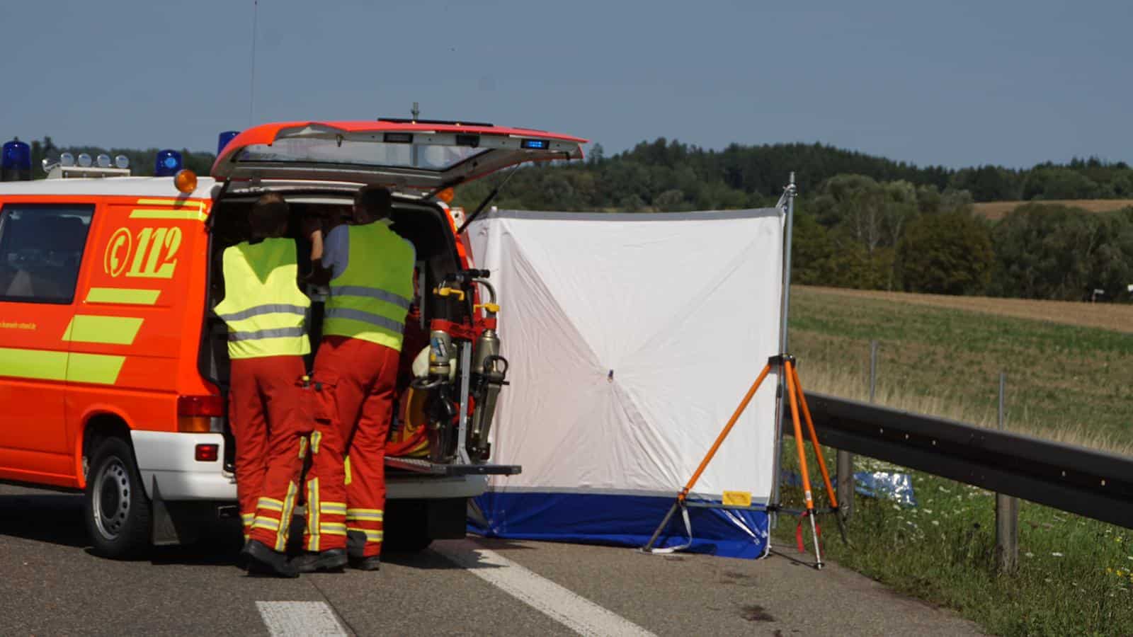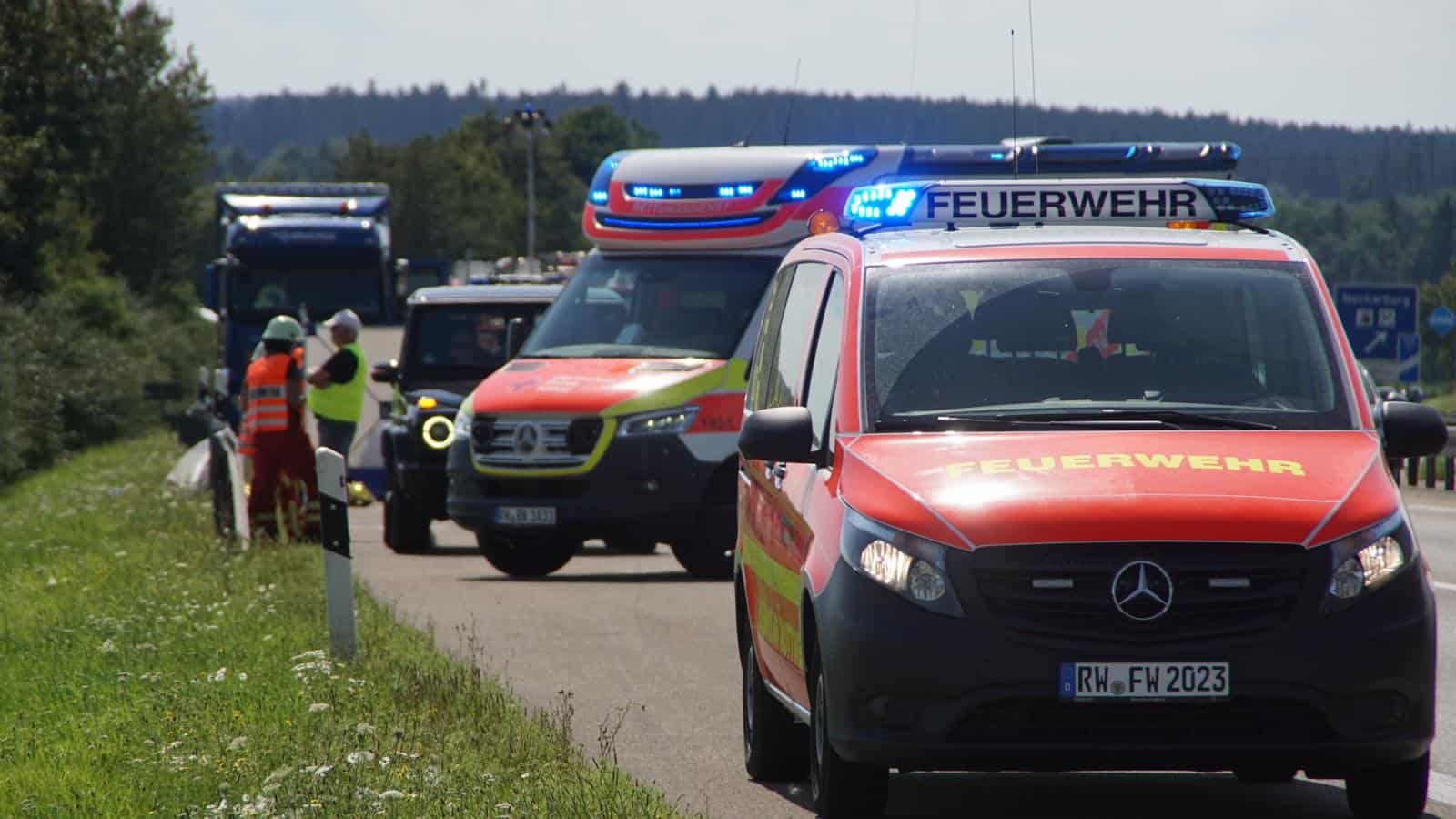 Schwerer Verkehrsunfall an der A 81 bei Rottweil. Ein Lkw-Fahrer ist tödlich verletzt worden. Rettungskräfte der Feuerwehr und des DRK sowie die Polizei waren im Einsatz. Es bildete sich rasch ein Stau.