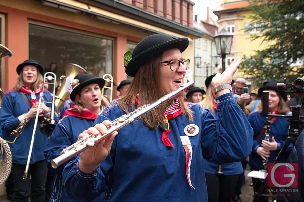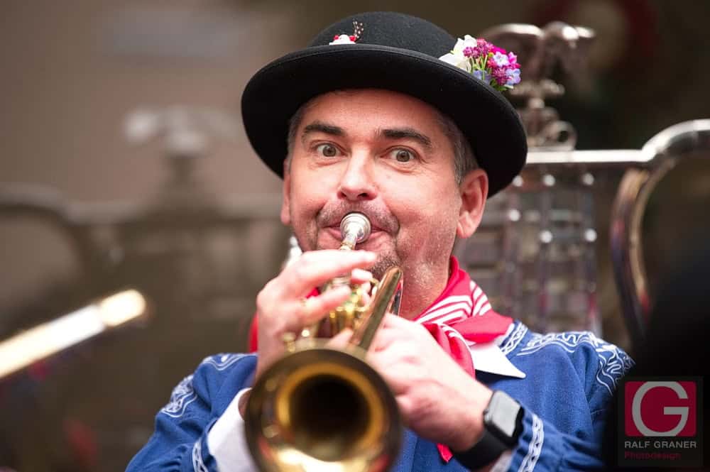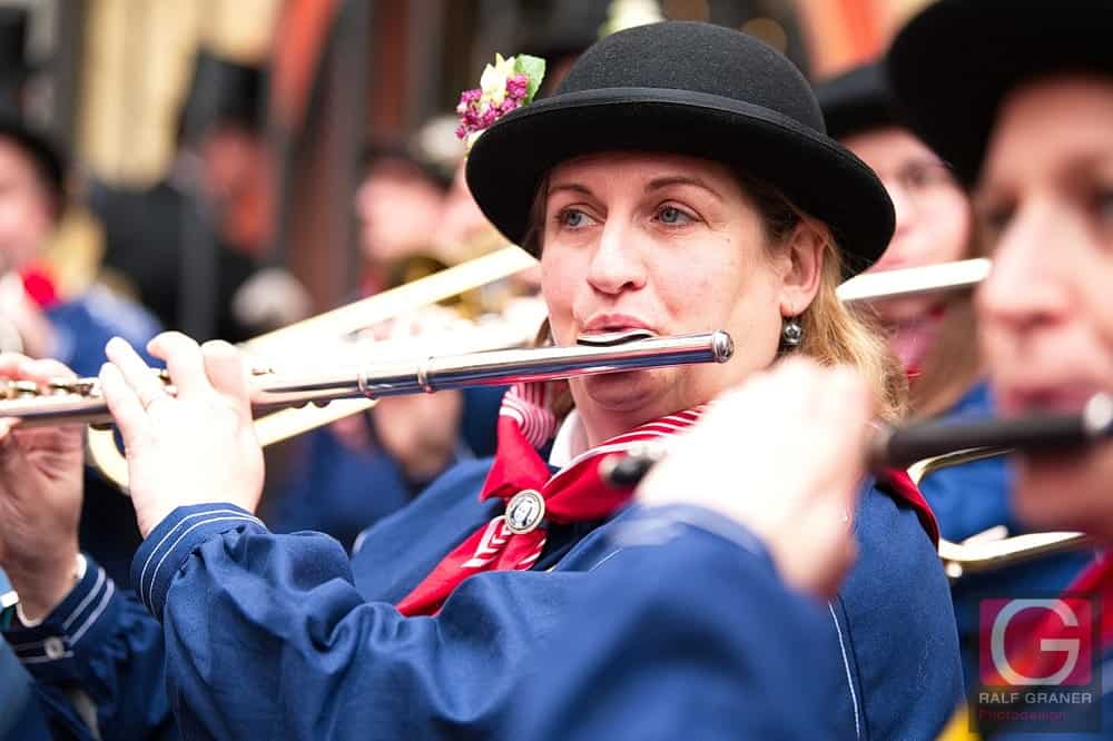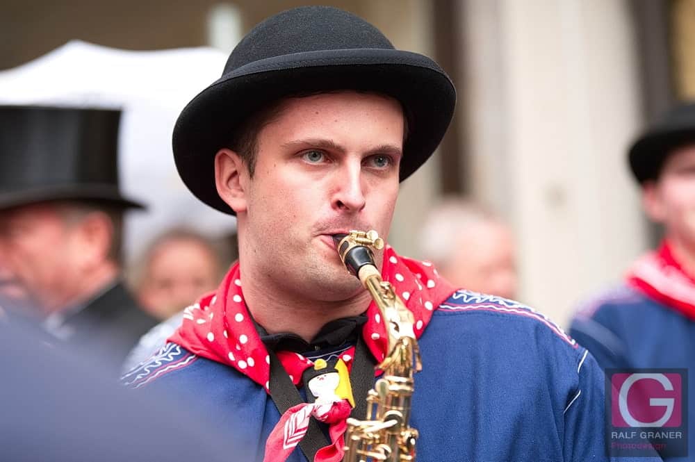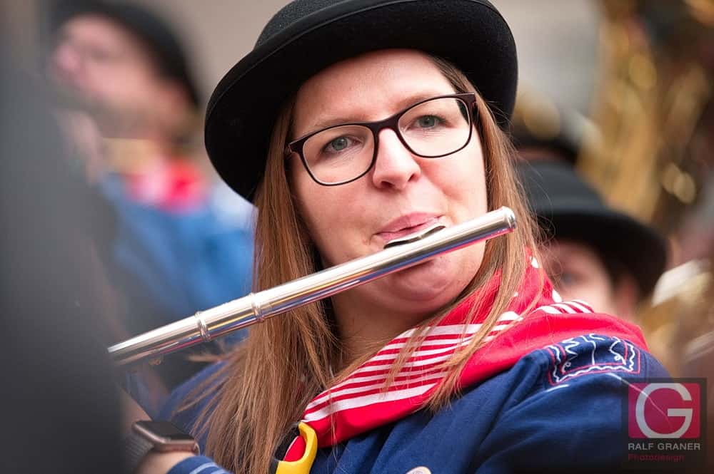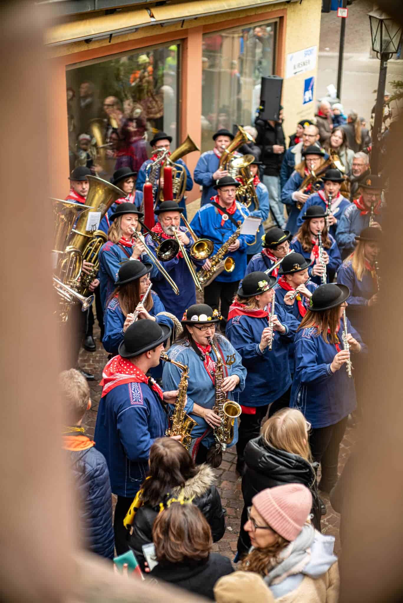 Der 6. Januar 2023 vor dem Café Schädle. Klepfer klepften mit viel Energie, die Tagwachtkapelle spielte Narrenmärsche – darunter den wahren, den Rottweiler Narrenmarsch, diesen gleich zweimal. Die Musikerinnen und Musiker zauberten den Menschen ein Strahlen in die Gesichter, brachten die Leute in Bewegung. Und manch einer der Musikanten, hauptsächlich im Bereich des tiefen Blechs, hatte selbst hörbaren, kaum zügelbaren Spaß an der Fasnetsfreude.