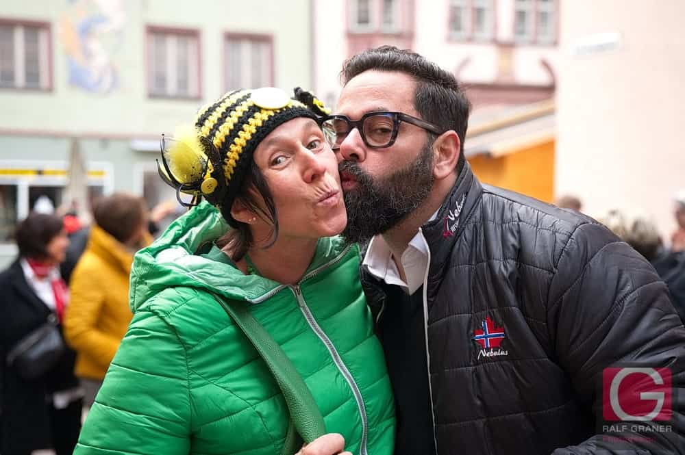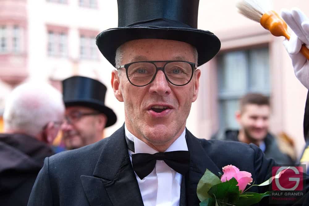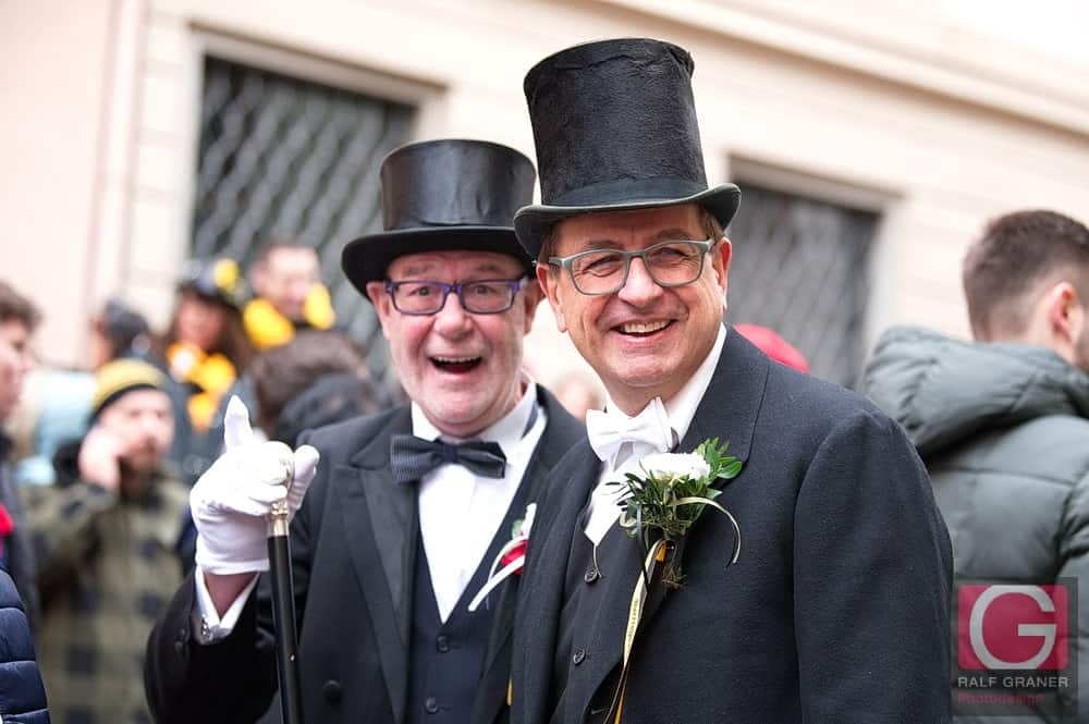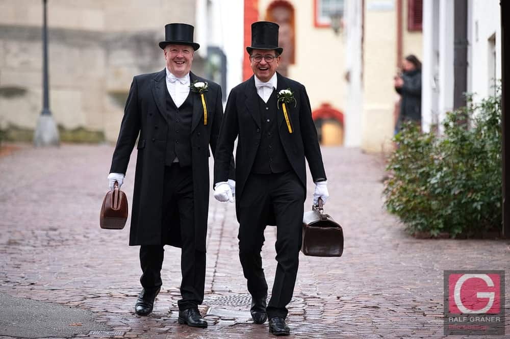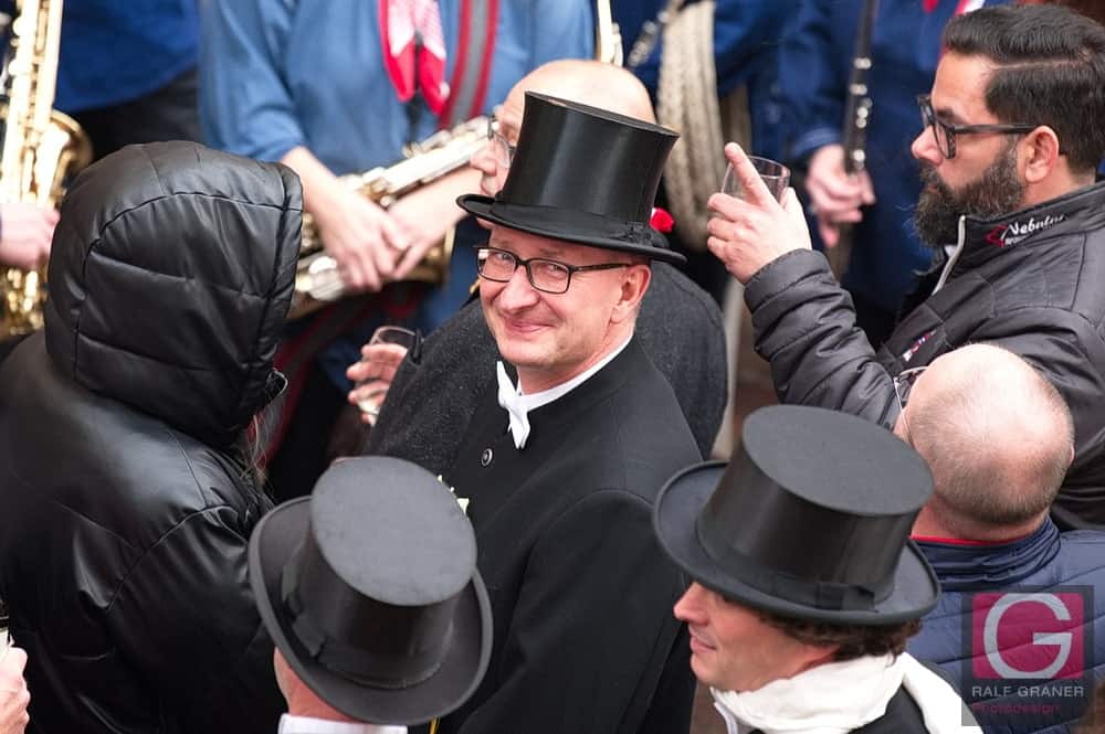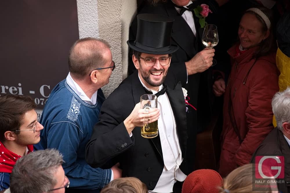 Narrenmeister Christoph Bechtold hat nach eigenen Angaben – und es blieb unwidersprochen, selbst der Amtsinhaber nahm das lächelnd hin – das Regiment in der Narrenstadt Rottweil von OB Dr. Christian Ruf übernommen. Dies mit einem hochqualifizierten Team aus seinen eigenen Reihen. Er wolle einen jeden nach dessen besonderen Qualitäten einsetzen, schwebte Bechtold vor. Darunter den Kassier der Rottweiler Zunft, Säckelmeister Stefan Roth, nicht etwa erwartungsgemäß in der Kämmerei, sondern als Beauftragten für die örtliche Gastronomie. Ihm stellte der Narrenmeister aber natürlich Unterstützer zur Seite, andernfalls hätte die Gefahr bestanden, dass die Menschen in den Gasthäusern künftig nur Wasser trinken dürften. Zum Hintergrund: Roth ist Abstinenzler, nimmt damit eine gewisse Sonderstellung in der Zunft ein.