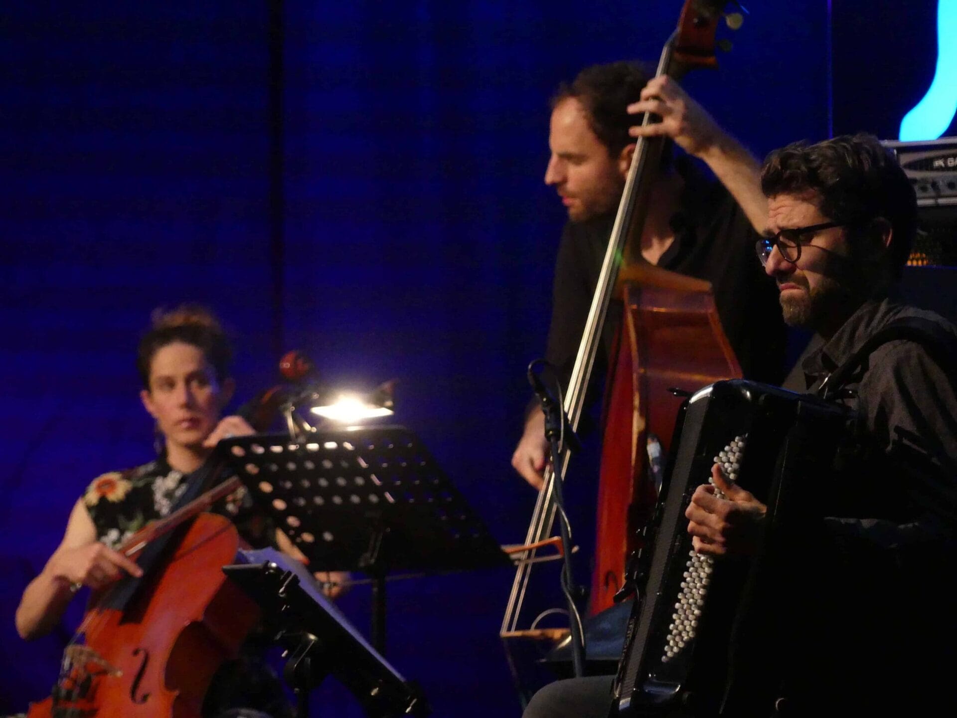 An diesem Abend klirrt und flirrt es auf der Bühne, wird gezupft, gestrichen, gehämmert und geklopft, in die Saiten, Tasten und Ventile gegriffen, dass es eine Freude ist. Die Jazzfest-Website listet allein sechs Links zu den Künstlerinnen, neben dem radio.string.quartet aus Wien mit Bernie Mallinger (Violine), Igmar Jenner (Violine), Cynthia Liao (Viola), Sophie Abraham (Cello) sind das Lukas Kranzelbinder (Kontrabass), Christian Bakanic (Akkordeon), Manu Delago (Percussion) sowie Thomas Gansch (Trompete, Flügelhorn) und als special guest Wolfgang Puschnig (Saxofone, Flöte).