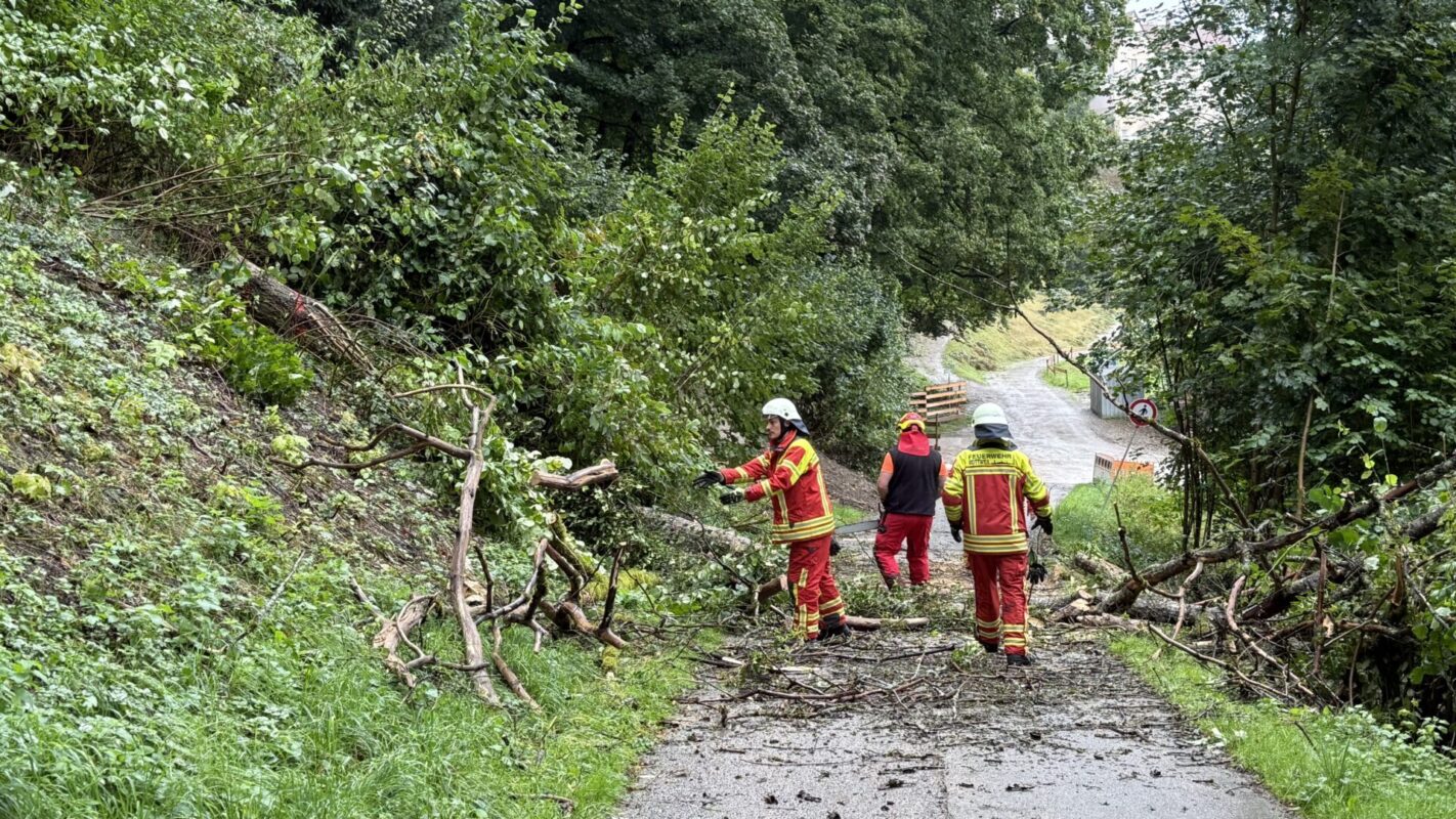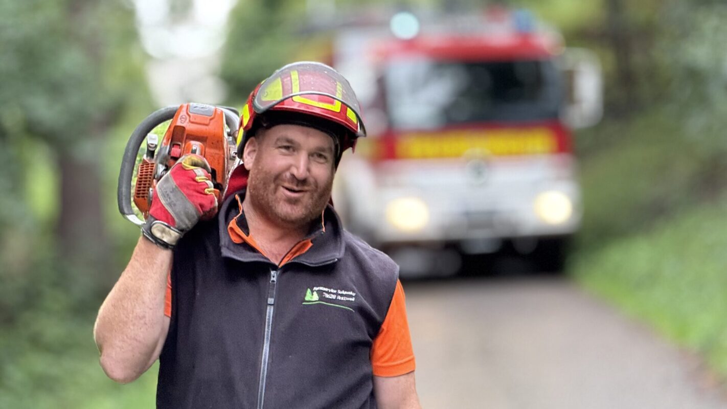 Der Rottweiler Feuerwehrmann, stellvertretende Abteilungskommandant und Motorsägenführer nach entsprechender Fortbildung, Jürgen Sigrist, machte sich bereit, legte die Schutzkleidung an und begann, den Baum zu zersägen. Stück für Stück, Ast für Ast, am Ende auch den Stamm. Der stand stark unter Spannung, weshalb Sigrist besonnen vorging, seine Kameradin und die Kameraden Abstand hielten. Zu Recht: Während der Arbeiten löste sich der im Hang liegende Baum, rutschte ein Stück, brachen Äste und flogen meterweit. Eine vorübergehend auch gefährliche Situation. Zudem verklemmte sich Sigrists Sägeblatt einmal, musste der Baum mittels eines Hubwerkzeugs angehoben werden. Um die Bruchstücke und Äste kümmerten sich weitere Feuerwehrleute, brachten sie zur Seite, um am Ende den Weg freizubekommen.