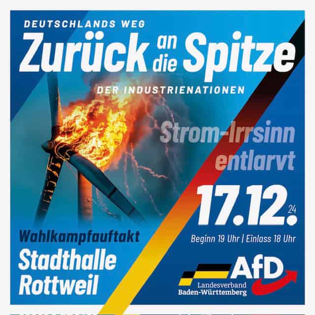 In der Einladung zum Wahlkampfauftakt in der Rottweiler Stadthalle spricht die AfD von einem „Stromirrsinn“, der entlarvt werde. Abgebildet ist ein brennendes Windrad. Man wolle „Deutschlands Weg zurück an die Spitze der Industrienationen“ aufzeigen. Beginn der Veranstaltung soll um 19 Uhr, Einlass ab 18 Uhr sein.