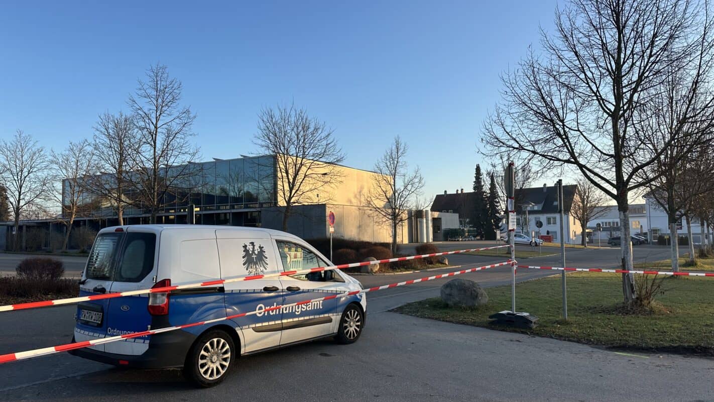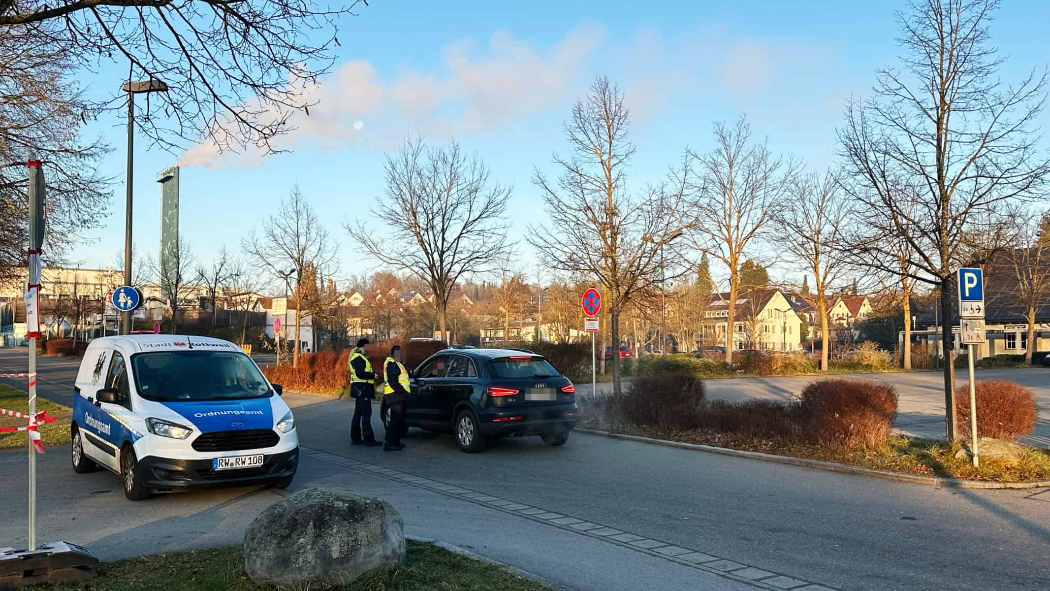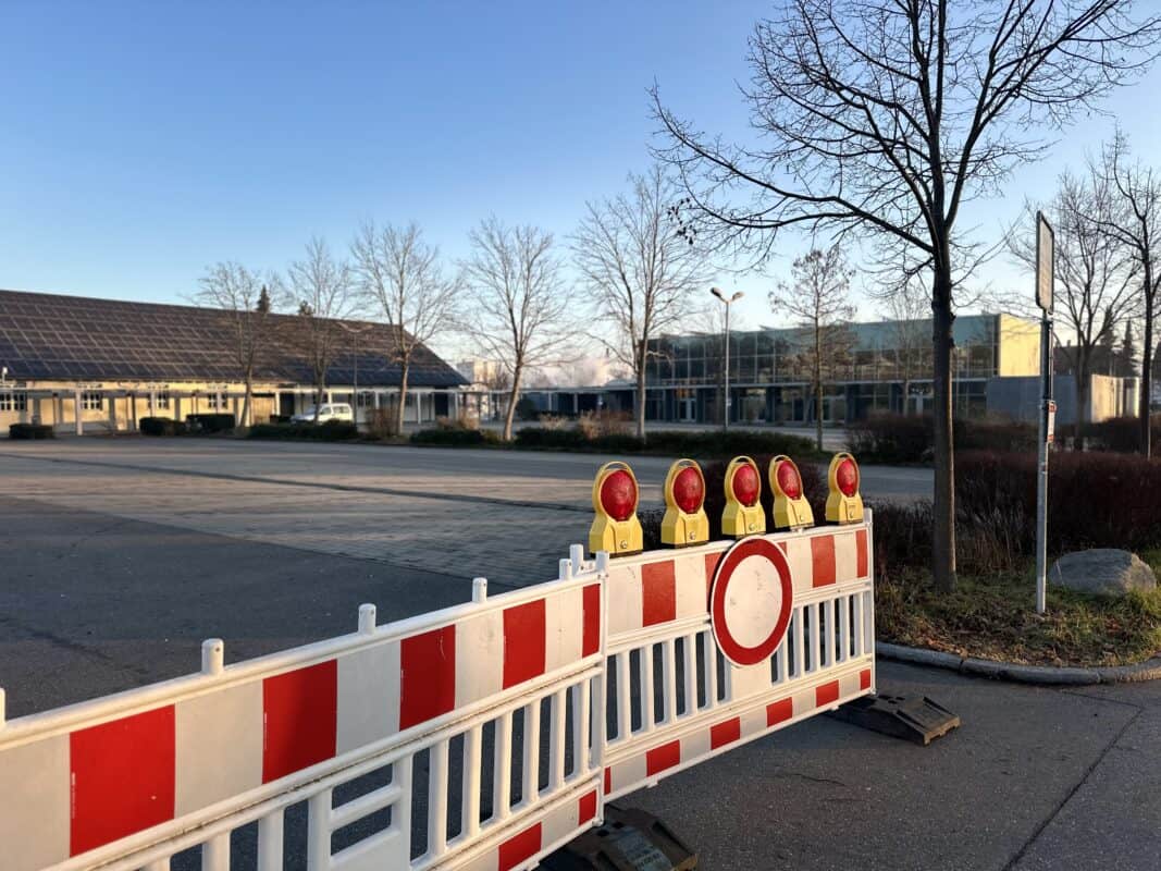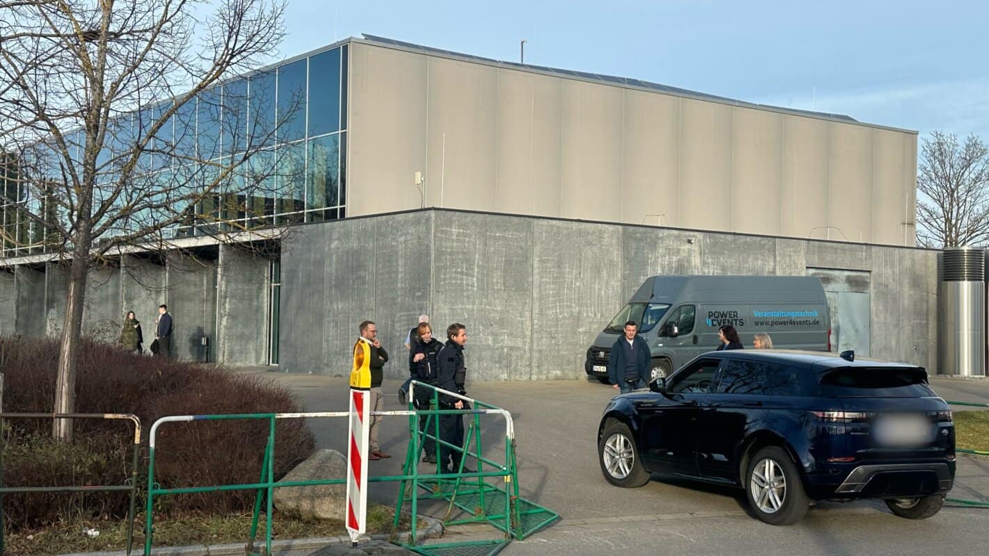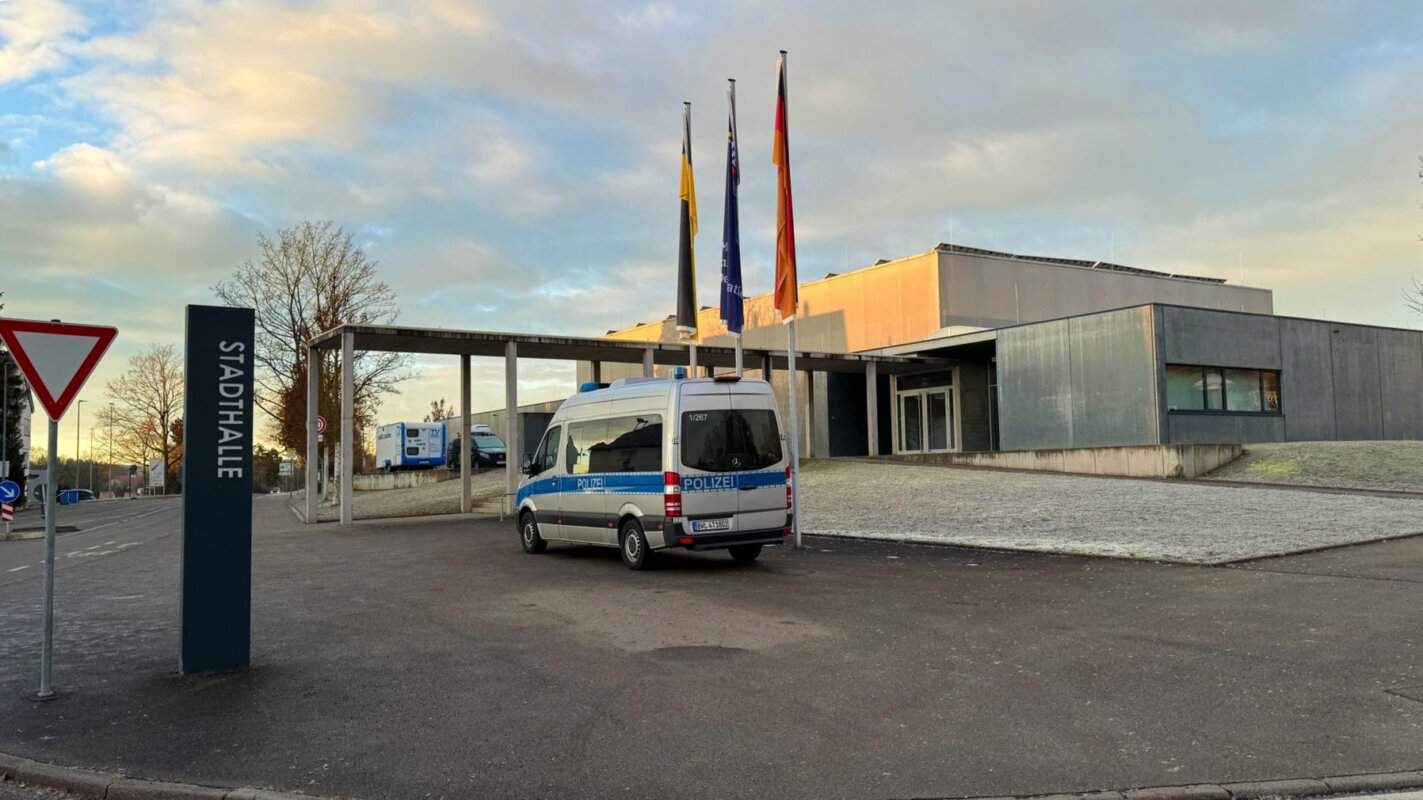 Ein Bereich an der Stadthalle ist weiträumig abgesperrt. Zunächst hat die Polizei Sperrbaken am Aquasol-Parkplatz aufgestellt, am Morgen hat zudem das Ordnungsamt den Schotterparkplatz abgeriegelt. Zwei freundliche Mitarbeiterinnen der Stadt erklären in der Eiseskälte des Morgens den ankommenden Autofahrerinnen und Autofahrern, wo sie ihren Wagen heute abstellen können.
