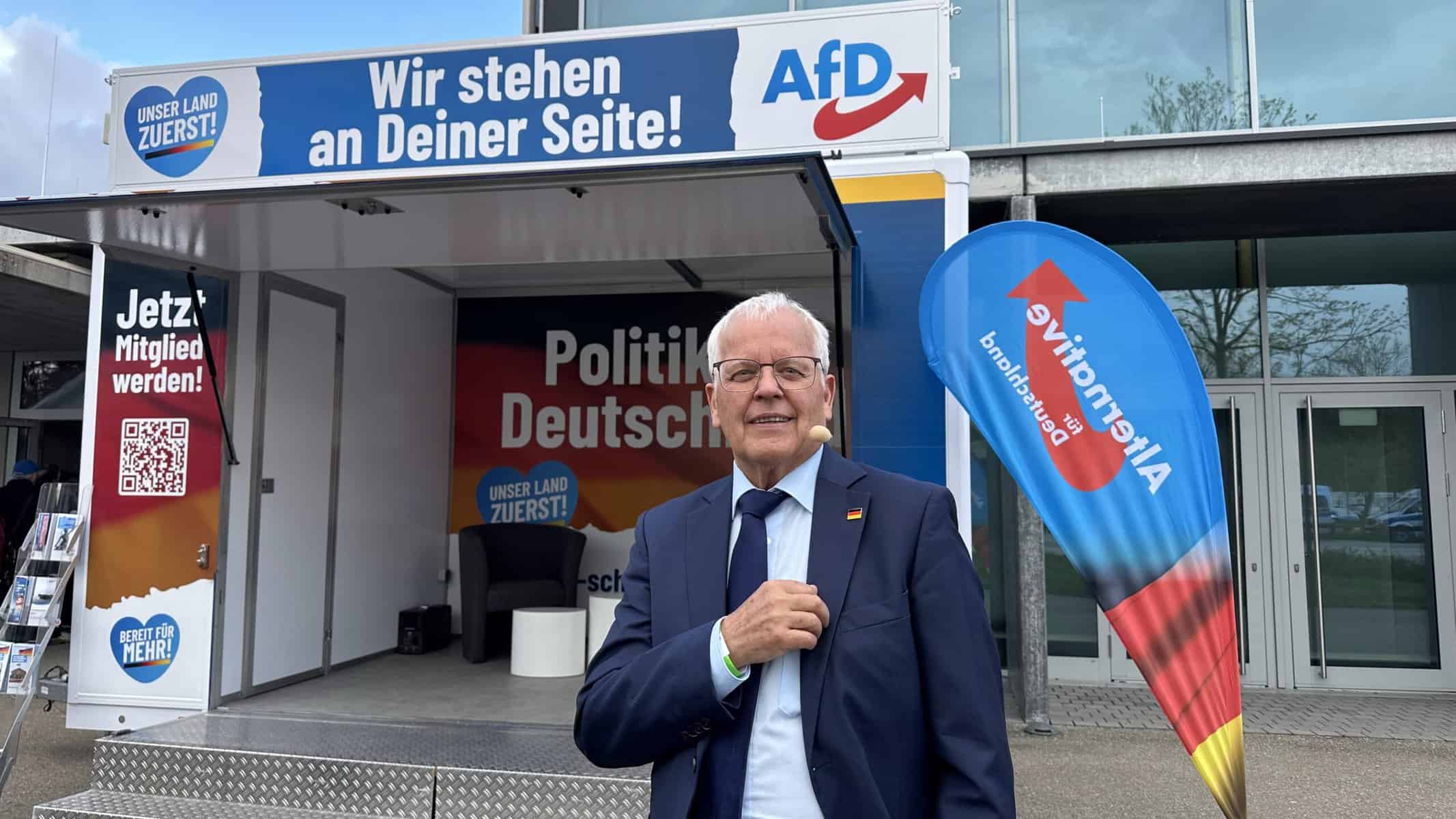 Der AfD-Landtagsabegeordnete Emil Sänze trifft ein. Er darf direkt an der Stadthalle parken, ebenso wie der Mann von der Beschallungs- und Lichttechnik.