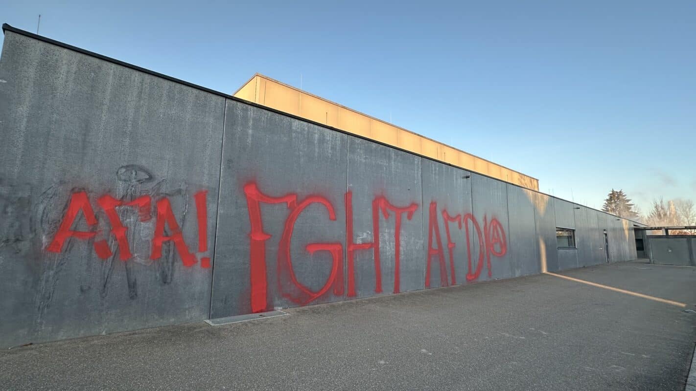 Ein (illegaler) Willkommensgruß aus Rottweil an die AfD: Graffiti an der Stadthalle. Foto: Peter Arnegger