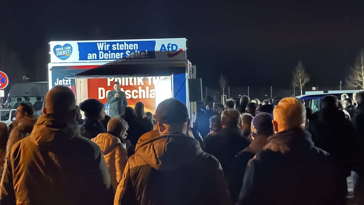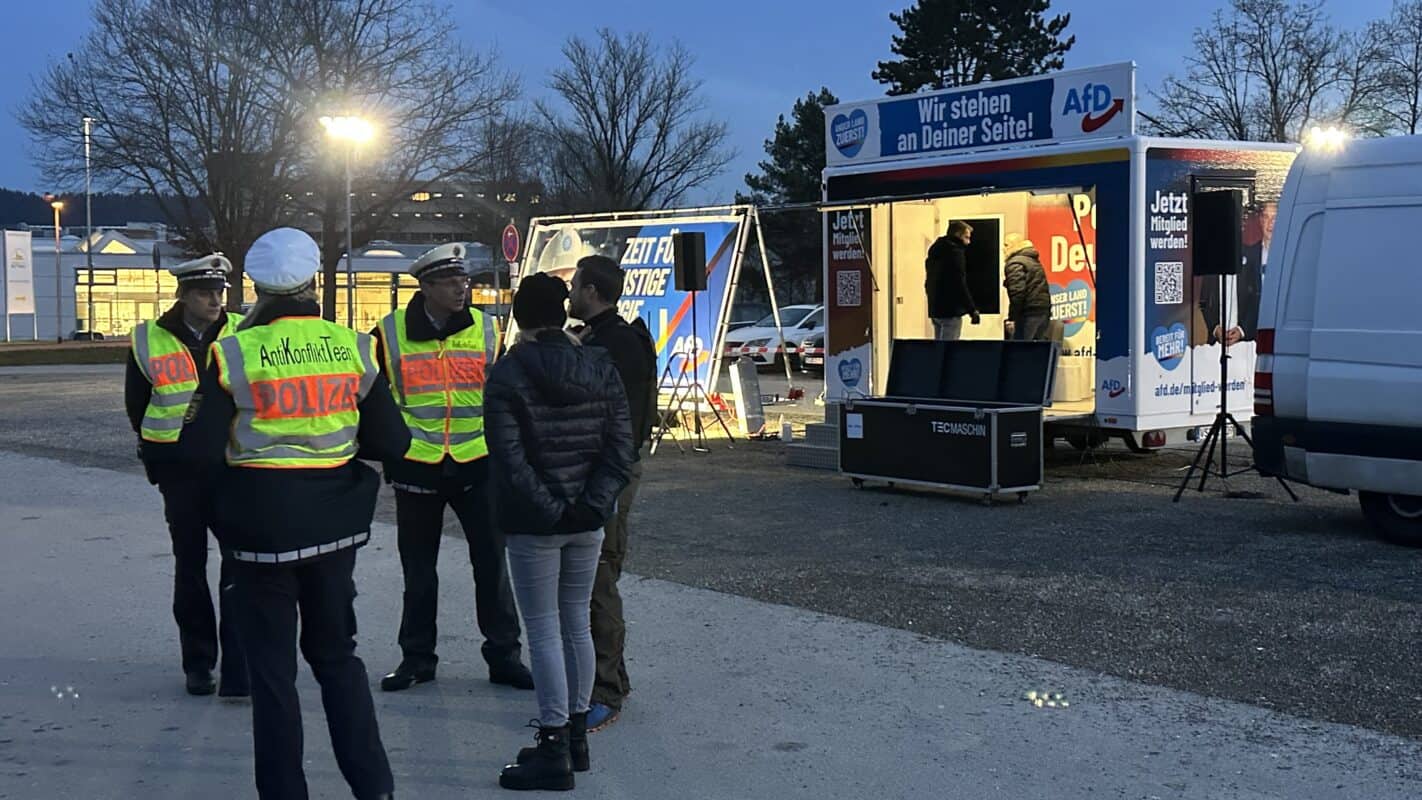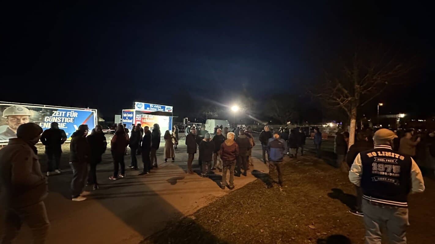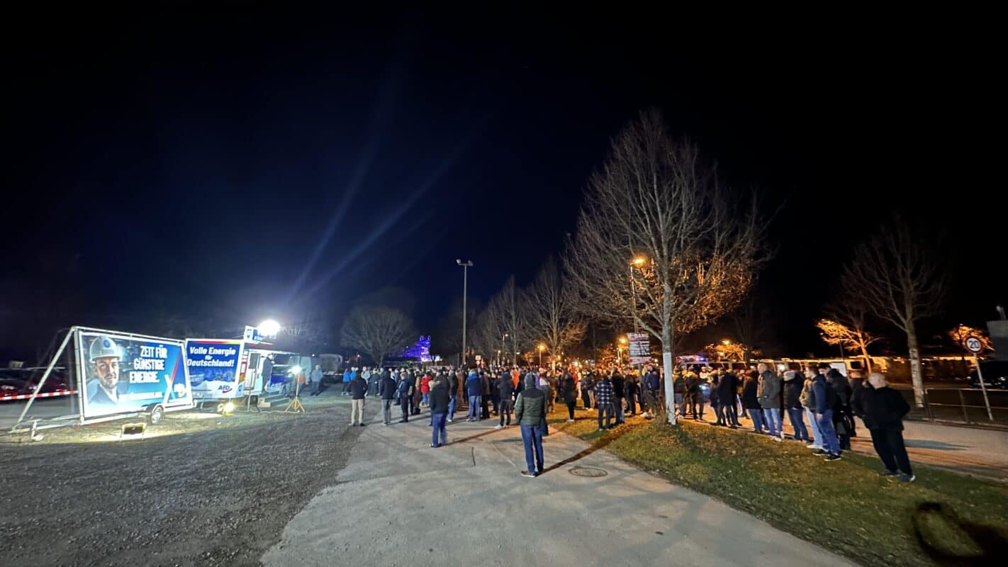 “Lassen wir die Antifa frieren“: Unter Buhrufen der Gegenseite beendet die AfD gegen 18 Uhr ihre Kundgebung. Die Menschen strömen in die Stadthalle.