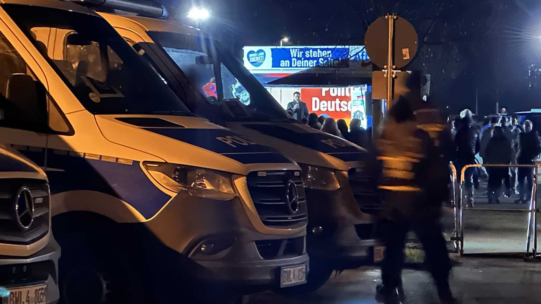 17 Uhr: Die Demos beginnen. Bei der AfD haben sich kurz vor 17 Uhr, dem offiziellen Programmstart, an die 50 Menschen versammelt, inklusive Polizei. Die Menge der Teilnehmenden an der Gegendemonstration ist deutlich größer. Noch herrscht Ruhe, wird aufgebaut, der Sound gecheckt. Die Polizei steht zwischen den beiden Gruppierungen. Eingesetzt ist eine hohe zweistellige Zahl an Beamtinnen und Beamten. Es ist bitterkalt.