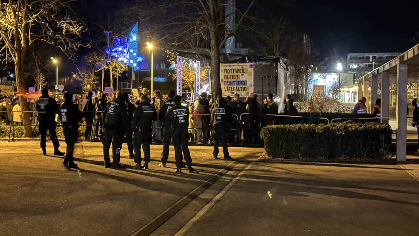 22.30 Uhr, ein Nachtrag, denn die Polizei zieht ein Fazit. Wir zitieren aus dem Polizeibericht: Am Dienstagabend hat eine Veranstaltung der „Alternative für Deutschland“ in der Stadthalle in Rottweil stattgefunden. Sowohl die Veranstaltung in der Halle, an der rund 1000 Personen teilnahmen*, als auch die Versammlung der AfD vor der Stadthalle sowie die Gegenversammlung des „Bündnis 90/Die Grünen“** mit etwa 600 Demonstranten verliefen aus polizeilicher Sicht friedlich. Im Rahmen der Versammlungen verzeichneten die Einsatzkräfte nach aktuellem Stand zwei Anzeigen wegen des Verstoßes gegen das Versammlungsgesetz (Mitführen eines Messers und eines Tierabwehrsprays) und eine wegen Beleidigung. Beim Verlassen der Veranstaltung wurden mehrere Frauen aus einer Personengruppe heraus beleidigt. Insgesamt 26 Personen kontrollierten die Beamten, hieraus erfolgten zwölf Platzverweise. Zur Gewährleistung des Versammlungsrechts sowie zur Aufrechterhaltung der öffentlichen Sicherheit und Ordnung befanden sich Beamtinnen und Beamte des Polizeipräsidiums Konstanz mit Unterstützung der Einsatzkräfte des Polizeipräsidiums Einsatz vor Ort.