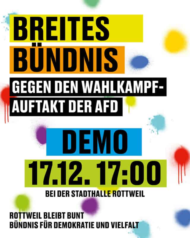 Update, 10. Dezember, 7.55 Uhr: „Mit einem breiten Bündnis stellen wir uns am 17.12. dem Wahlkampfauftakt der AfD entgegen.“ Gegner der Partei aus dem Bündnis „Rottweil bleibt bunt“ haben mit diesen Worten inzwischen ihren Protest angekündigt. Zur Erinnerung: Ihr Widerstand führte zur Absage eines AfD-Infoabends Mitte November im Eisenbahner-Sportheim (siehe unten). Die Absage verband Emil Sänze, Sprecher des AfD-Kreisverbands RW-TUT und Landesvorsitzender, mit dem Versprechen, dann eben zu einem anderen Zeitpunkt in die Stadthalle Rottweil gehen zu wollen. Dieser Zeitpunkt ist am 17. Dezember 2024 gekommen.