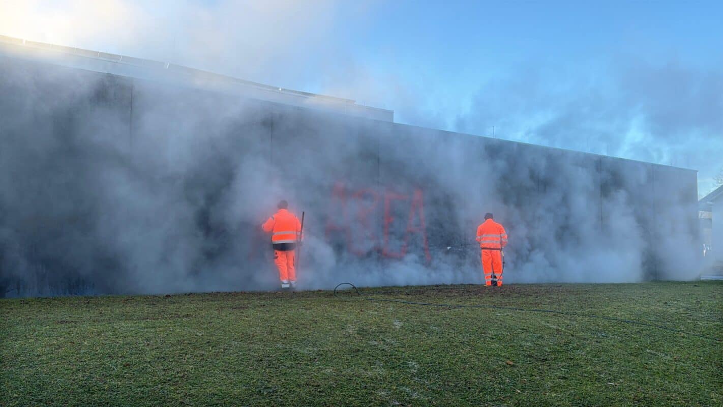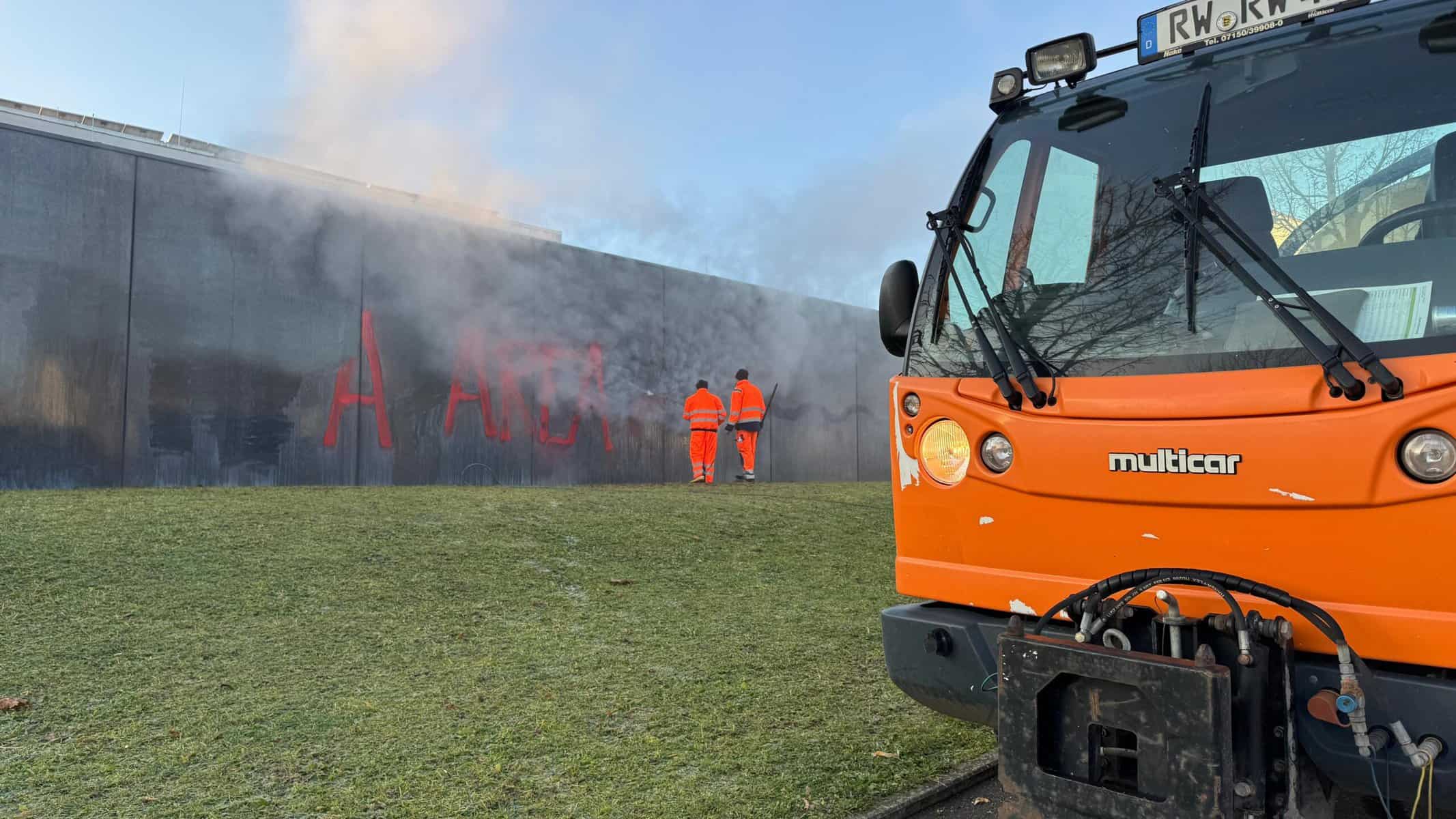 Um das Graffiti kümmert sich am Dienstagmorgen bereits der Rottweiler Betriebshof. Mit Dampfstrahlern rücken die Mitarbeiter den Schmierereien zu Leibe.