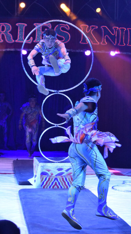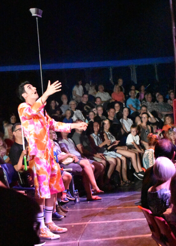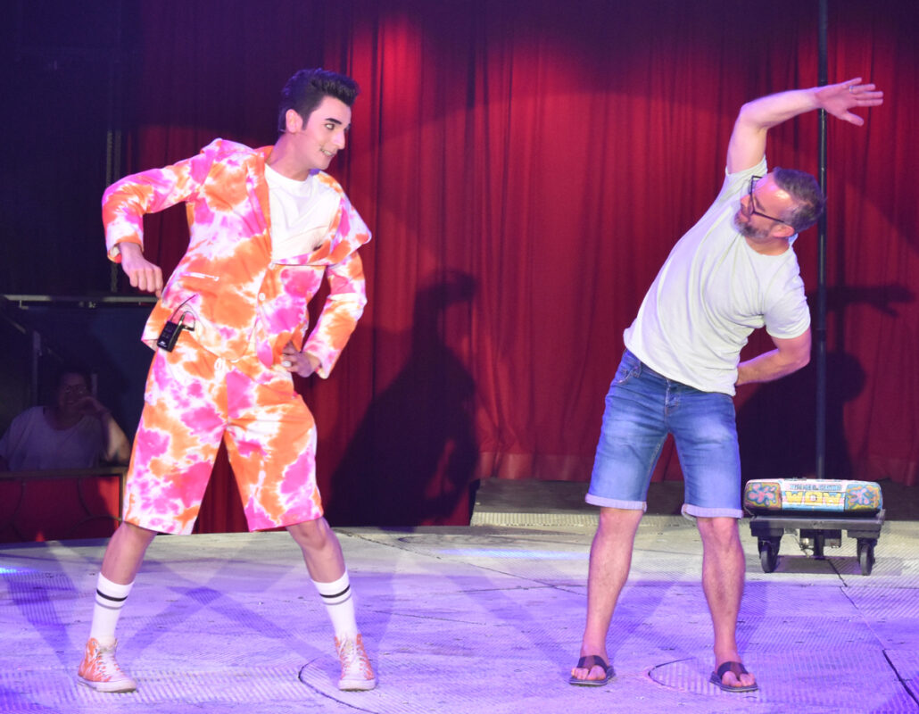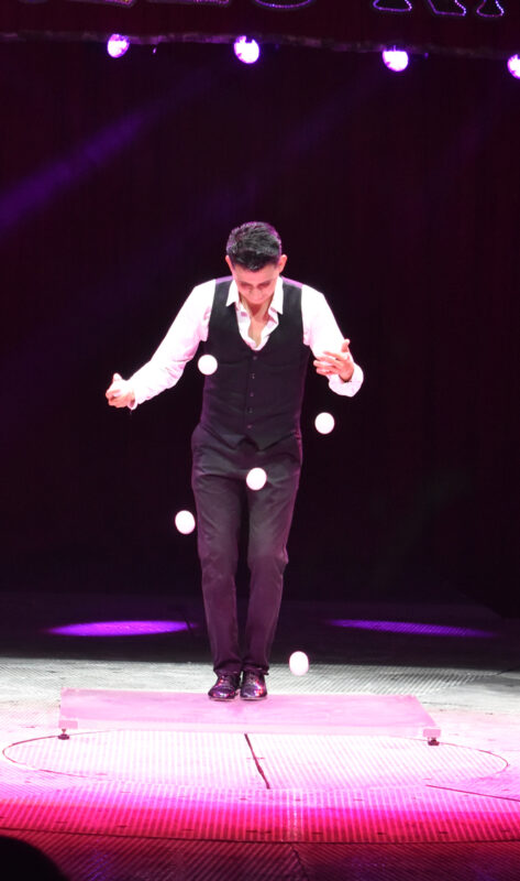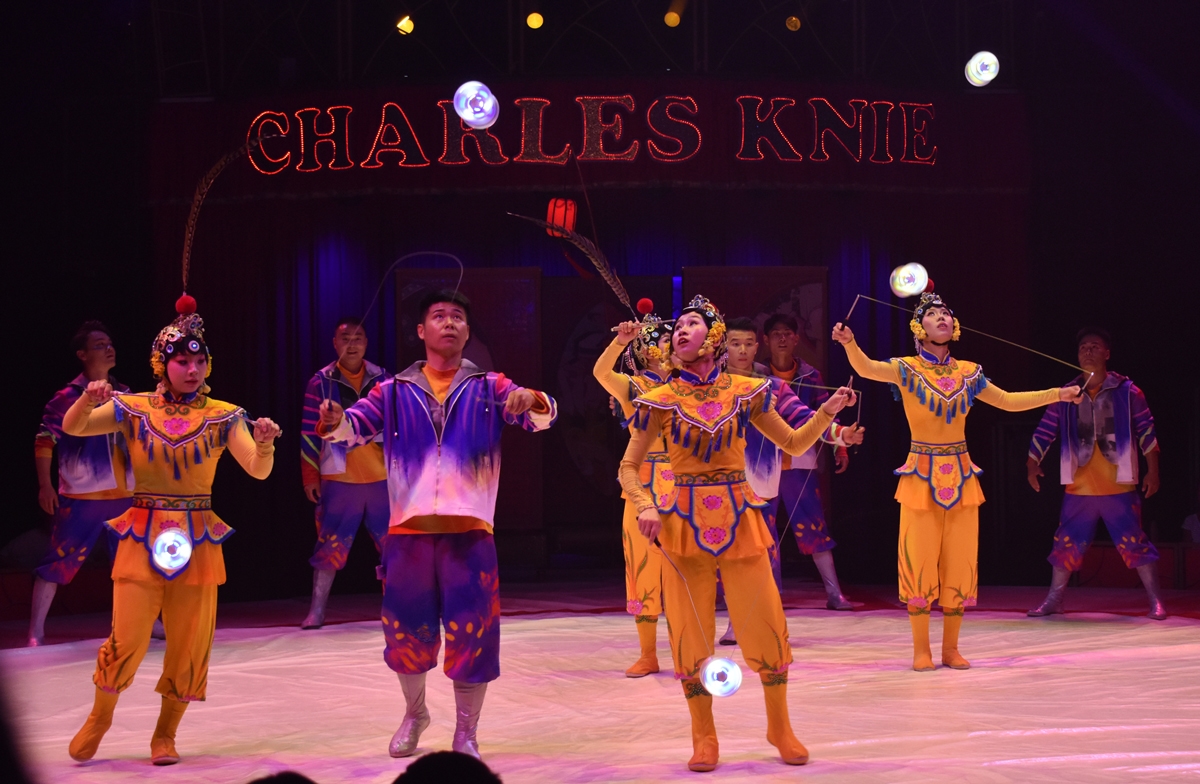 Die Abfolge in Form einer Revue, ohne lange Pausen dazwischen, ließ kaum Verschnaufpausen für die Zuschauer. Und wenn es mal einen Umbau gab, kam Clown Micael ins Publikum und gewann so schnell die Sympathie im Zirkusrund. Die Klima-Anlage hatte bei den heißen Außentemperaturen, den vielen Zuschauern und den vielen Lichtquellen eine Menge zu tun – aber es wurde nie zu heiß.