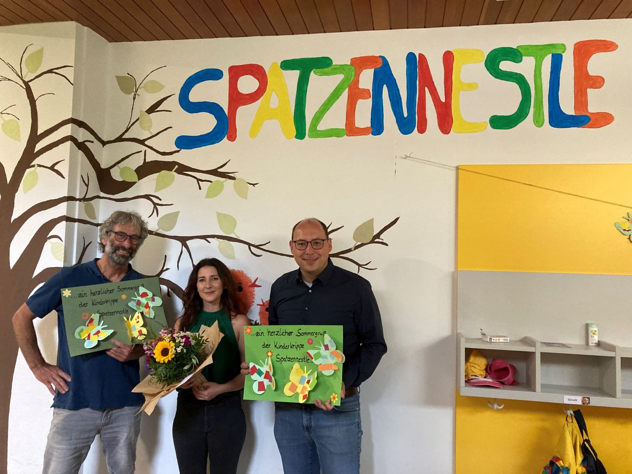 Rottweil-Göllsdorf – Oberbürgermeister Dr. Christian Ruf und Ortsvorsteher Reiner Hils begrüßten sie nun auch persönlich in ihrer neuen Funktion. Bei einem Besuch nahmen sich OB Ruf und Ortsvorsteher Hils Zeit für ein Gespräch mit Tamara Kovacic und dem Team. Gemeinsam tauschten sie sich über die aktuelle Situation in der Einrichtung aus: Derzeit werden 14 Kinder betreut – aus Göllsdorf, Zepfenhan und auch aus Neufra. Insgesamt bietet die Krippe derzeit Platz für 20 Kinder, durch sogenannte Platz-Sharing-Modelle können aktuell 24 Kinder betreut werden.