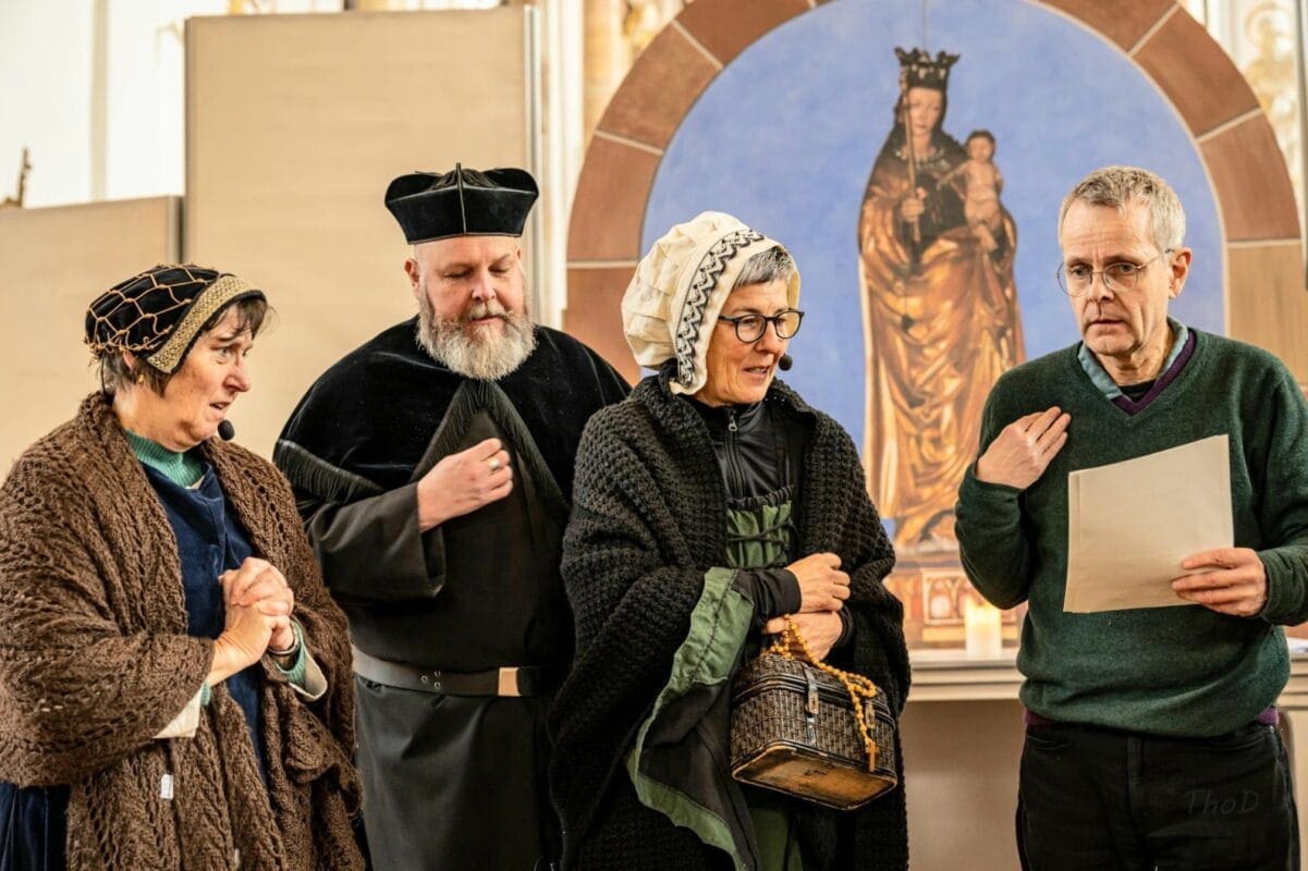 Das und die tolle Resonanz auf das Theater-Projekt schon im Vorfeld, freuen die über 40 Akteure, die sich hinter diese Sache geklemmt haben. Und seit Monaten mit viel Energie und Hingabe die Aufführungen vorbereiten – von den Textern über die Schauspielerinnen und Schauspieler, einem als „Ökumänner“ firmierenden Chor unter der Leitung von Patrick Mink und weitere Musiker. Bis zu allen die bei Kostümen, Requisite und der pfiffigen Ausstattung angepackt haben.