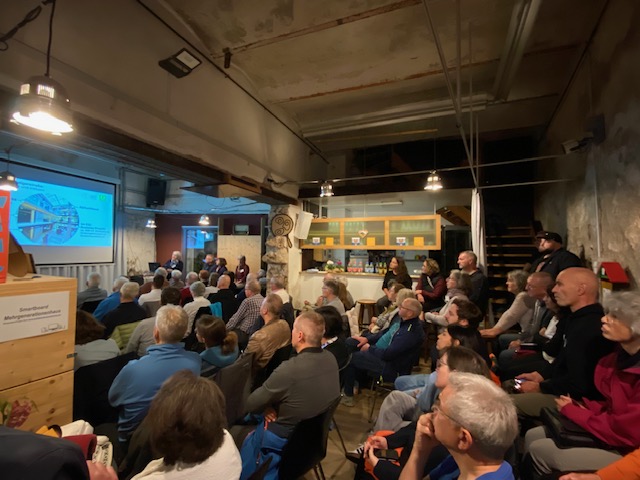 Im weiteren Verlauf des Abends stellte Klaus Nerz, einer der Geschäftsführer der Oekogeno Freiburg, die dem LebensOrt Rottweil als Projektpartnerin zur Seite steht, die Arbeit dieser großen Genossenschaft vor. Nachhaltigkeit, Gemeinwohl, Vielfalt wurden als tragende Säulen ihrer Arbeit benannt: Sinn statt Gewinn. Zum besseren Verständnis wurden bereits bestehende Häuser in kurzen Filmbeiträgen gezeigt, sowie die Stimmen einiger Bewohnerinnen und Bewohner zum dortigen Leben zu Gehör gebracht.