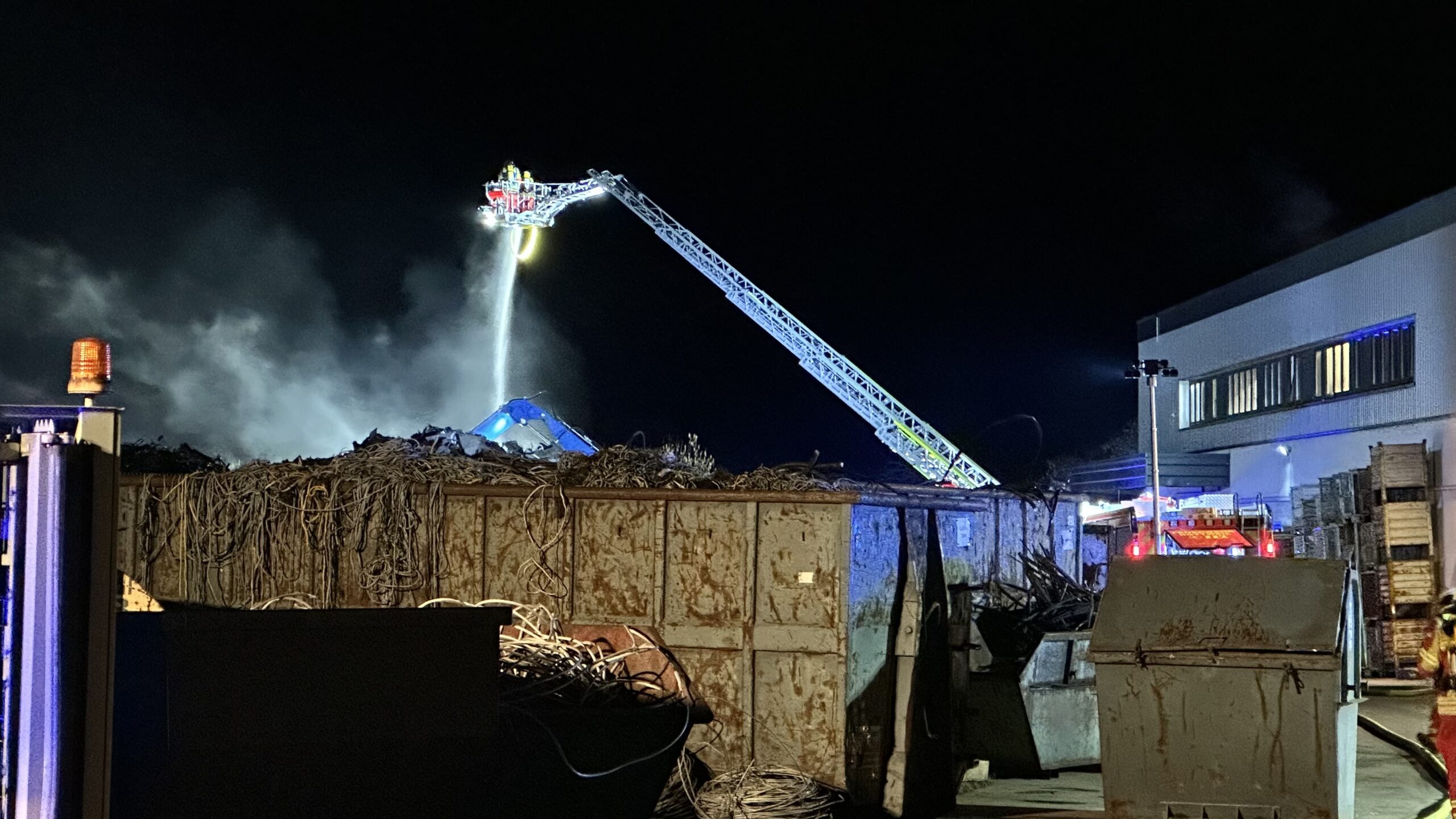 Tatsächlich von der Kuttelsuppe, von der Schmotzigenfeier weg, wurden die Feuerwehrkräfte am Donnerstagabend in Rottweil alarmiert: Brand bei einem Schrott- und Recyclingunternehmen. Ein Container stand in Flammen. Zunächst war das Feuer als recht klein eingestuft, mit der niedrigsten Stufe alarmiert worden. Weil die aus der Rottweiler Altstadt als erste eintreffenden Kräfte dann rasch Wasser sowie weitere Einsatzkräfte benötigten, rückte ein Löschzug aus. Die Fahrzeuge und Feuerwehrleute aus der Kernstadt wurden von Kräften aus Bühlingen und Göllsdorf unterstützt. Auch der sogenannte Großtanker der Rottweiler Wehr war vor Ort, um einen schnellen Angriff auf den im Container brennenden Schrott vornehmen zu können. Zu diesem Zeitpunkt bestand offenbar die Gefahr, dass das Feuer auf die Umgebung übergreifen könnte.