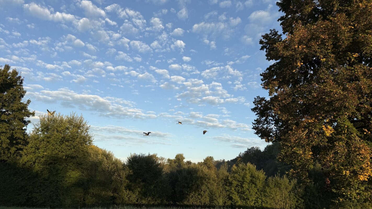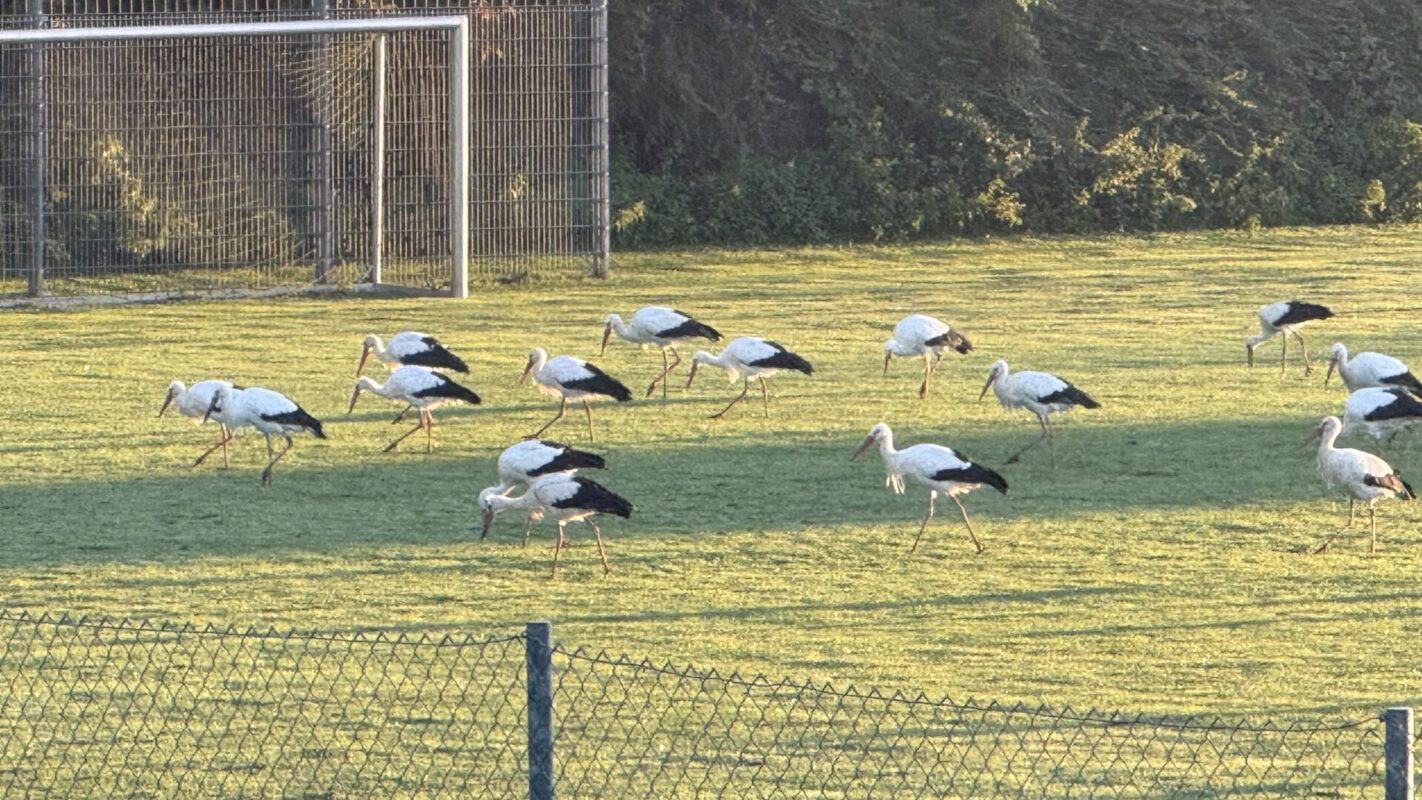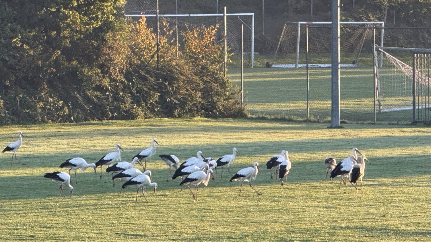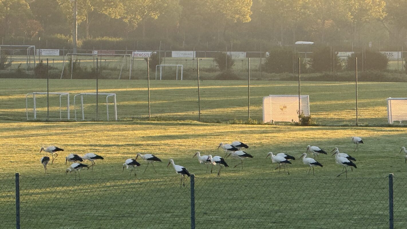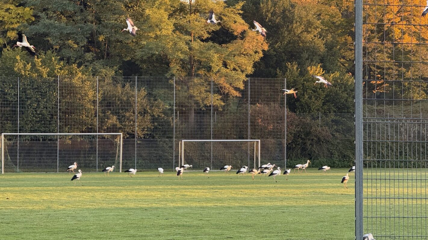 „Der Storchenzug entstand während vieler Jahrtausende als eine Verhaltensanpassung an die jahreszeitlich wechselnden klimatischen Bedingungen in Europa und Afrika“, erklärt dazu der Naturschutzbund Nabu. Dabei sei es weniger die Kälte als vielmehr die winterliche Nahrungsknappheit, die den langen Zug nach Afrika erfordert. Tatsächlich schreiten die Tiere die Rasen und Wiesen, auf denen sie an diesem Samstagmorgen landen, weiter auf Nahrungssuche ab. Ein Schnabelklappern liegt über den Sportplätzen. Einige der Vögel hatten die Gruppe zwischenzeitlich verlassen, kehrten dann zurück – um den anderen offenbar mitzuteilen, dass es ein paar hundert Meter weiter eine ungestörte Fläche gebe. Und nach und nach erheben sich alle, um dorthin zu fliegen, wo an diesem Morgen wenig Wanderer und Hundegänger unterwegs sind.