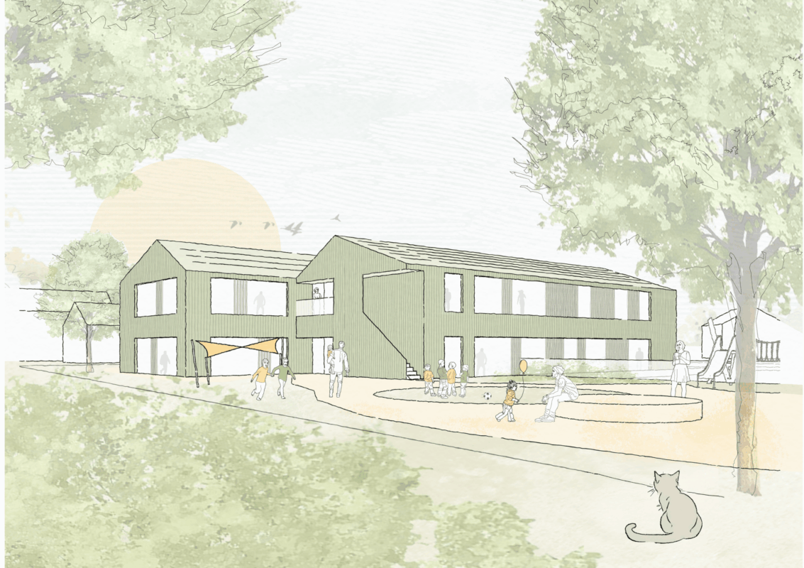 Der Spielbereich im Nordwesten soll von Spielinseln geprägt sein, die verschiedene Aufenthalts- und Bewegungsmöglichkeiten bieten. „Ein Sandspielplatz, Kletterelemente und Balancierstämme schaffen ein abwechslungsreiches Spielumfeld. Die Stellplätze für Pkw und Fahrräder befinden sich seitlich des Haupteingangs, sodass die Eingangssituation verkehrsberuhigt bleibt“, so die Verwaltung.