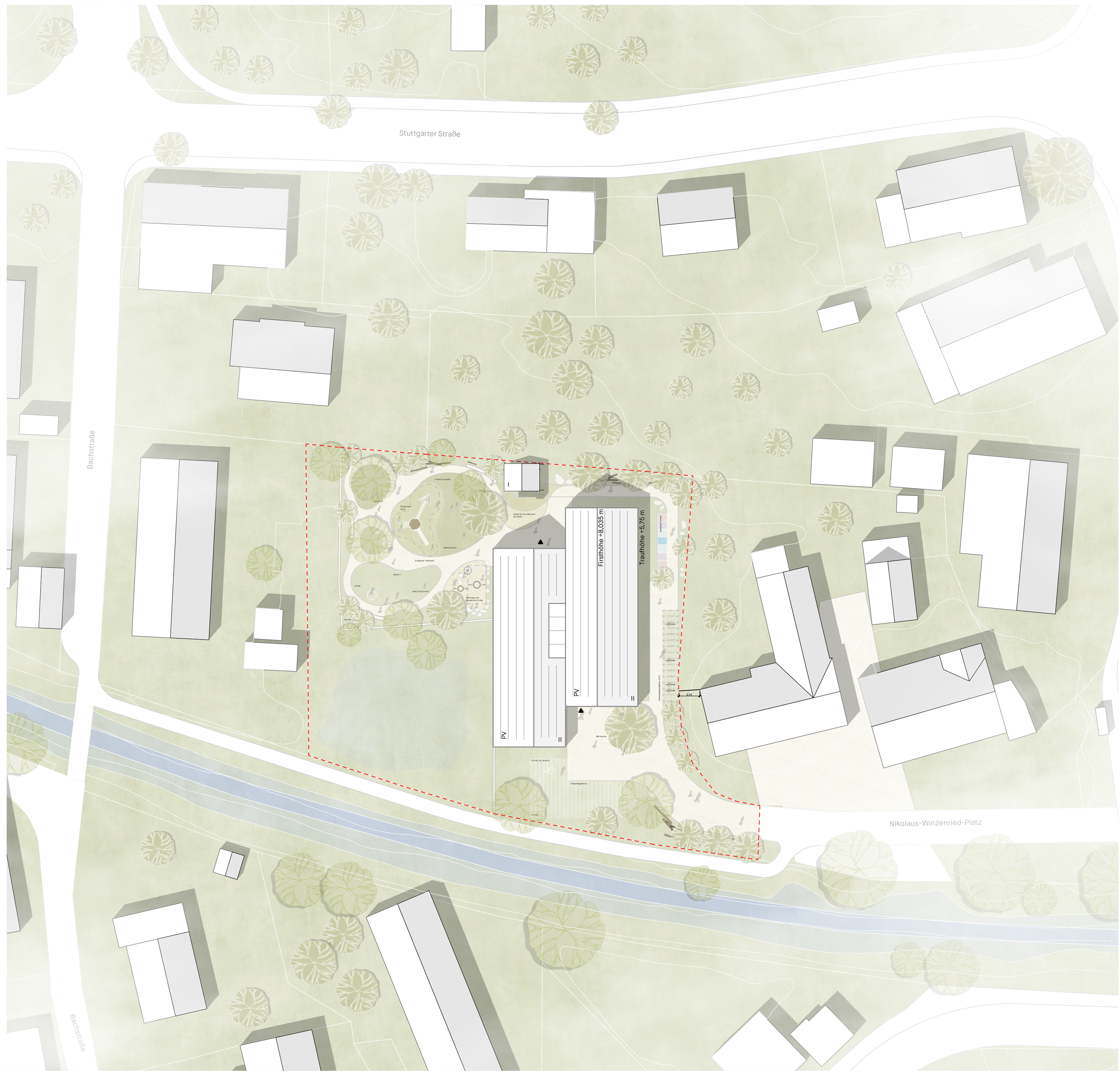 Der neue Neufraer Kindergarten fügt sich laut Architekten, Kirchengemeinde und Stadtverwaltung harmonisch in das bestehende Umfeld ein. „Das Gebäude gliedert sich in zwei zueinander versetzte Gebäude mit Satteldachriegel, die den Haupteingang und den Spielbereich im Garten definieren. Der Neubau orientiert sich an den südlichen und östlichen Grundstücksgrenzen und öffnet sich nach Westen hin zum Garten. Der Vorplatz im Süden bildet das Entrée zum Kindergarten und dient gleichzeitig als zentraler Erschließungsbereich“, heißt es seitens der Verwaltung.