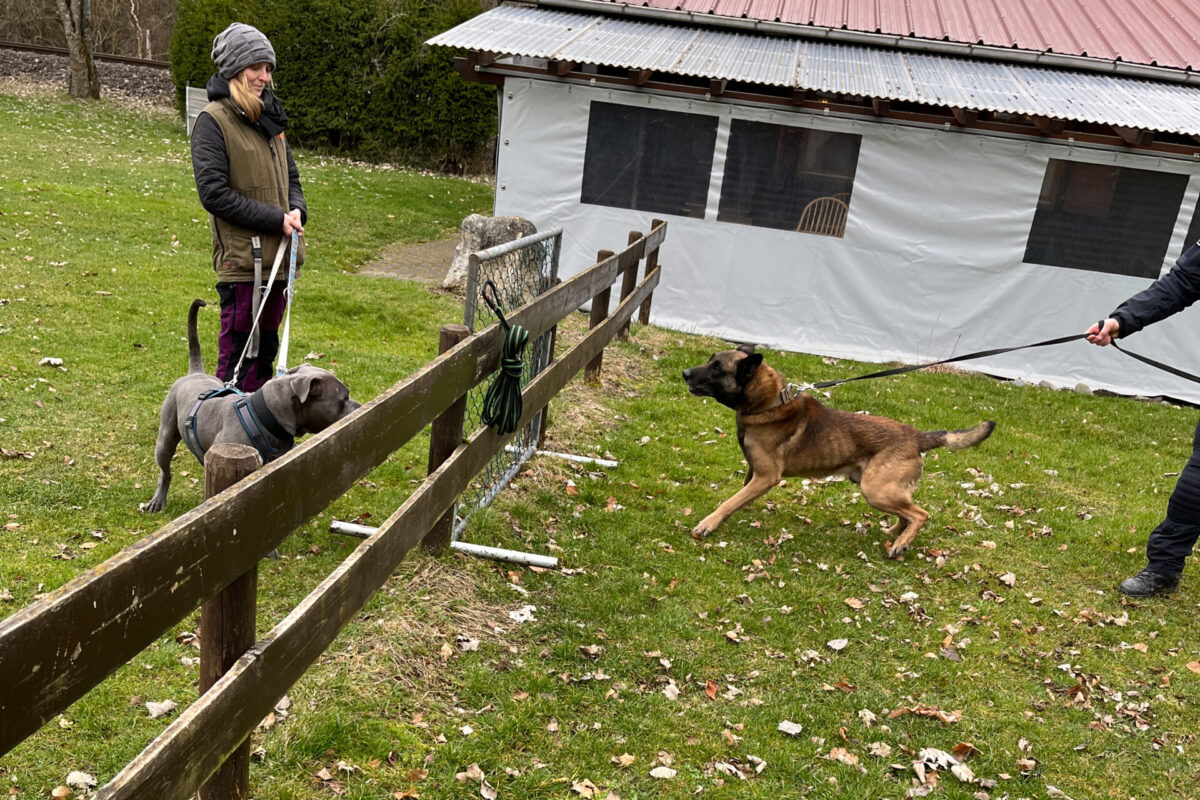 Zu einer vollständigen Prüfung gehört auch die Konfrontation mit einem fremden Hund, der auf der anderen Seite des Zauns auf den Prüfling zugeht und lautstark bellt. Es ist eine Situation, die zeigt, wie stabil ein Hund bleibt, wenn der Artgenosse laut wird. Ein junger Hund aus einem Tierheim hat an dieser Stelle die Nerven verloren und wird den Test wiederholen müssen.