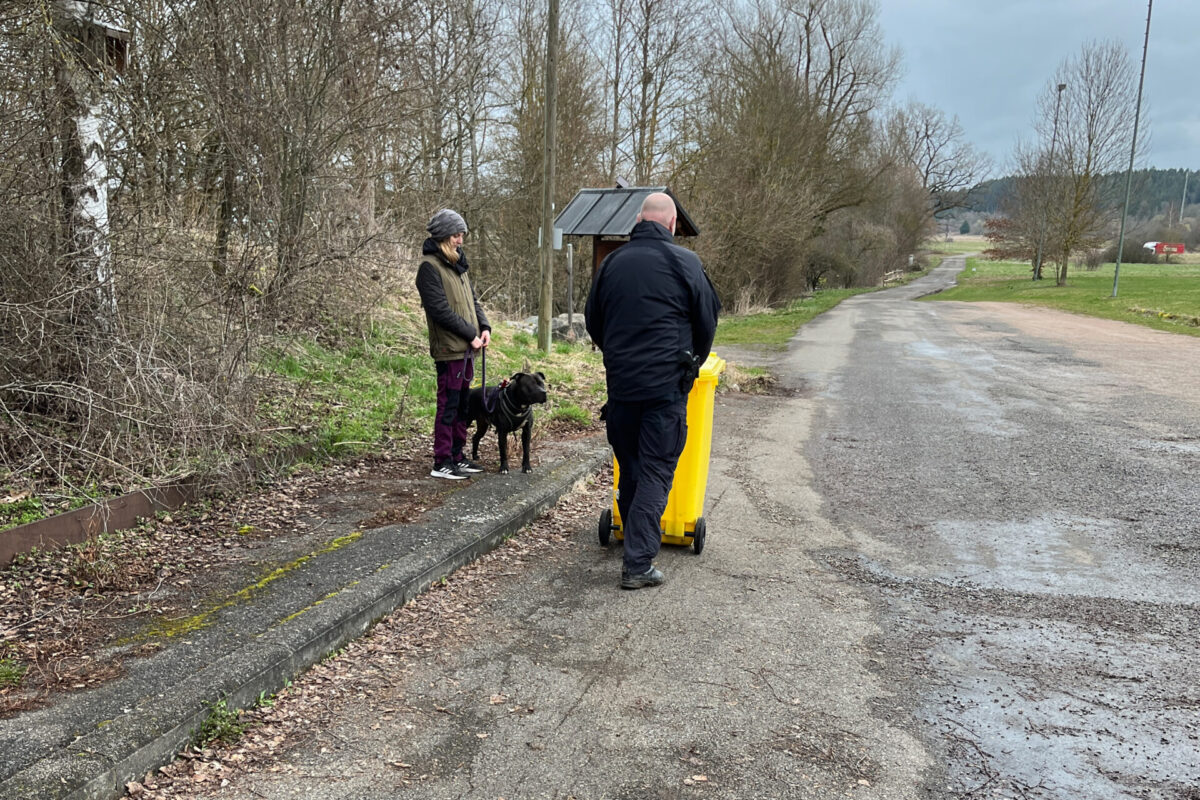 Zum Abschluss folgt eine Übungsrunde auf dem Gehweg vor dem Hundeplatzplatz: ein Fahrrad, ein Kinderwagen, eine klappernde Mülltonne und ein Besen sind nun die Herausforderung – Alltagssituationen, die für die meisten Hunde zwar Routine sind, aber für die Prüfer einen wichtigen letzten Blick auf das Gesamtverhalten des Tieres bedeuten.