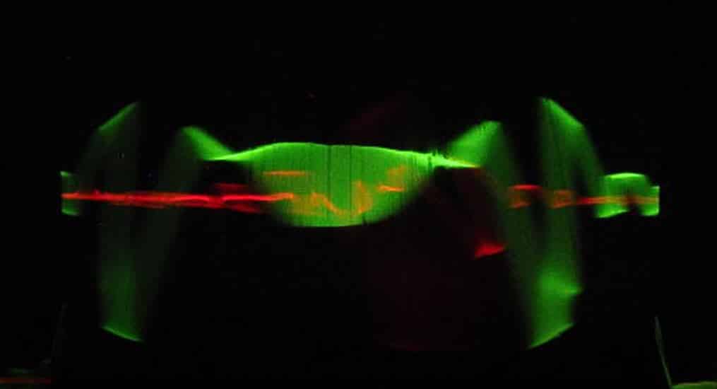 Im dunklen Keller der Galerie hat er ein flaches Wasserbecken aufgebaut, dessen Oberfläche davor installierte Linienlaser einen perfekten Spiegel bildet. Ein grüner und zwei rote Laser sind so ausgerichtet, dass sie – den Gesetzen der additiven Farbmischung folgend – auf der dahinter stehenden Projektionswand zu einem gelben Lichtstrich verschmelzen.