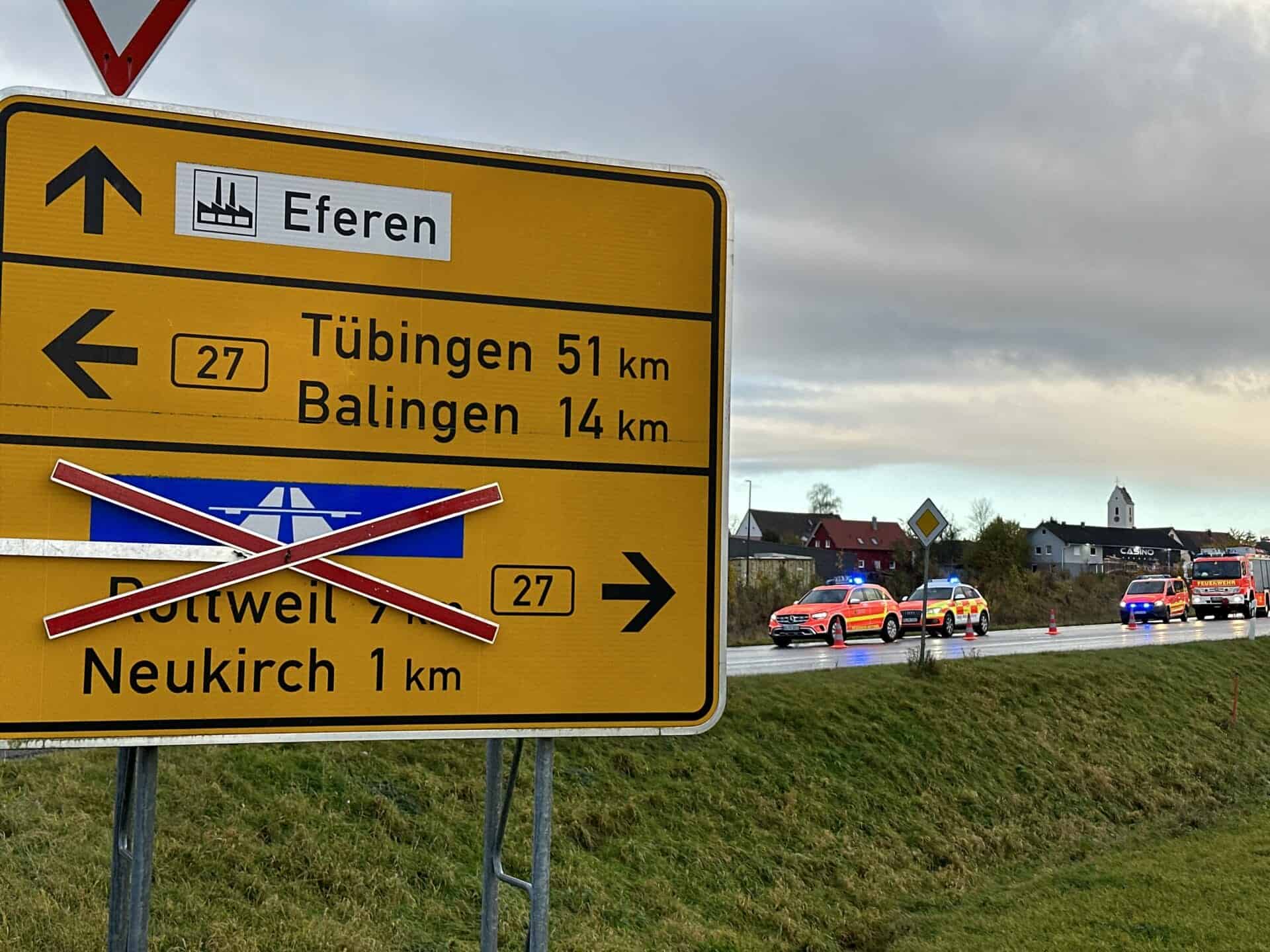 (Rottweil). Der Unfall geschah an einer Kreuzung der B 27 zum Industriegebiet Eferen bei Neukirch. Aus bislang noch ungeklärter Ursache sind zwei Fahrzeuge zusammengeprallt. Eines wurde in den Straßengraben abgewiesen. Die beiden Insassen verletzten sich bei dem Unfall. Laut dem Organisatorischen Leiter Rettungsdienst, Etienne Bantle, seien die Verletzungen leicht. Wie sich herausstellte, mussten beide Unfallbeteiligten nicht in ein Krankenhaus eingeliefert werden. Nach der Versorgung in einem Rettungswagen konnten sie vom DRK entlassen werden.