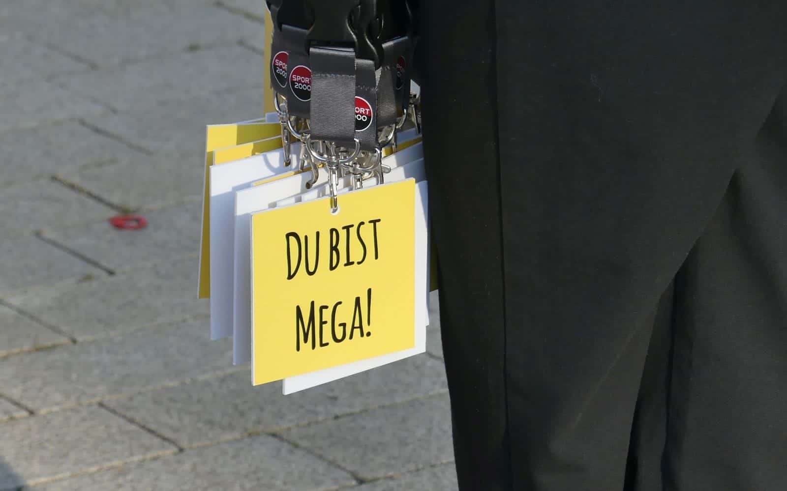 Am Sonntag gegen 9 Uhr ist der Rathausplatz noch nicht so stark belebt. „Erst ein kleiner Teil ist bisher angekommen“, so Jonas Fuß. „Die meisten kommen zwischen zehn und zwölf.“ Diejenigen, die „durch“ sind, werden von den anderen bejubelt und beklascht und bekommen einen gelben Anhänger: „Du bist mega“ um den Hals. Mancher holt sich ein kühles Bier. Auch ein Schnäpsle gibt’s oder am Verpflegungswagen etwas, um Kalorien aufzubauen.