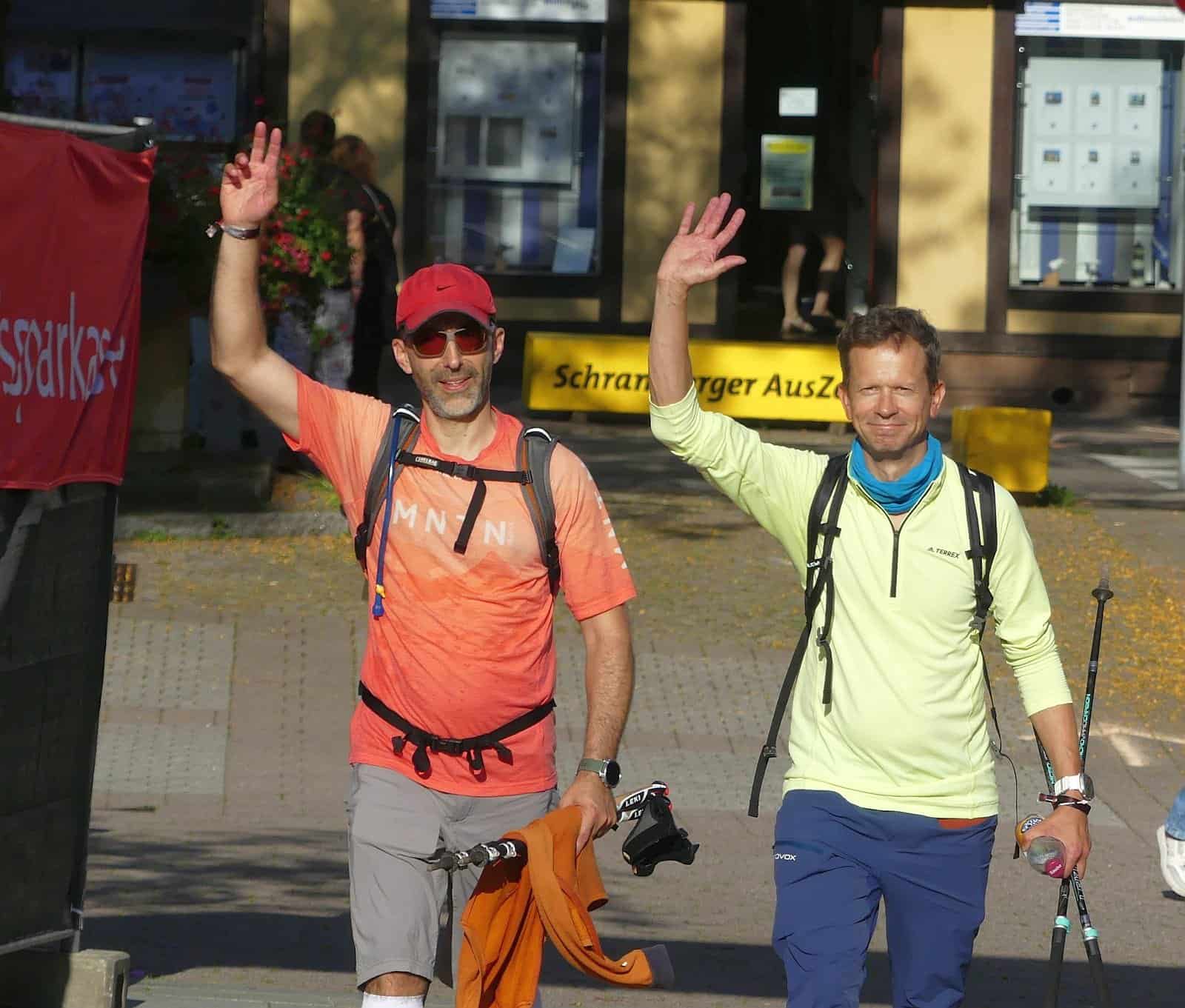 Stadtrat Clemens Maurer und Architekt Roland Hess kommen gegen 9.30 Uhr gemeinsam durch Ziel. „Toll war‘s“, sagt Hess, „aber heftig.“ Der Aufstieg von Wolfach aufs Moosenmättle sei ihm ewig vorgekommen, das sei der härteste Abschnitt gewesen, weil der schier nicht enden wollte, berichtet Maurer. Das Wetter sei ja super gewesen, eher zu warm. „Ich hab‘ kräftig geschwitzt.“