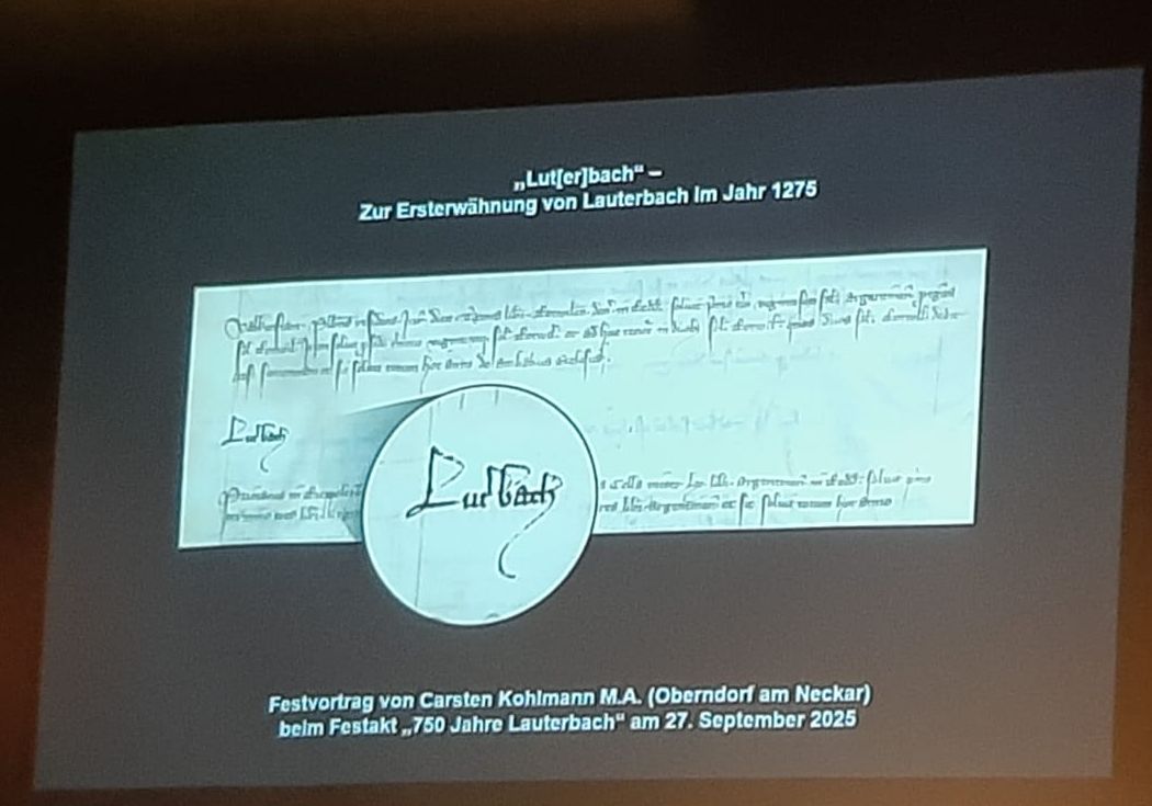 Schließlich hat der Kulturwissenschaftler und Historiker Carsten Kohlmann in seinem Festvortrag berichtet, wie Lauterbach entstanden ist und wo Luterbach erstmals urkundlich erwähnt wurde. Nämlich im „Liber decimationis“, dem Zehntbuch, der Diözese Konstanz aus dem Jahr 1275. Das Buch hatten die Mönche angelegt, um aufzuschreiben, aus welchem Dorf und welcher Pfarrei der Kreuzzugzehnte bereits eingezahlt worden sei.