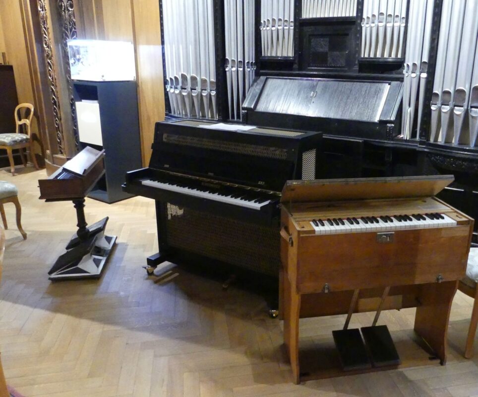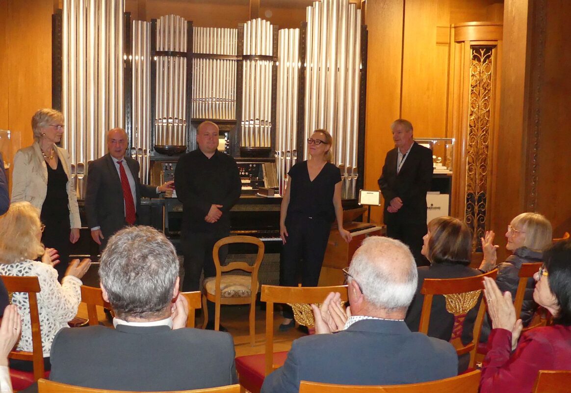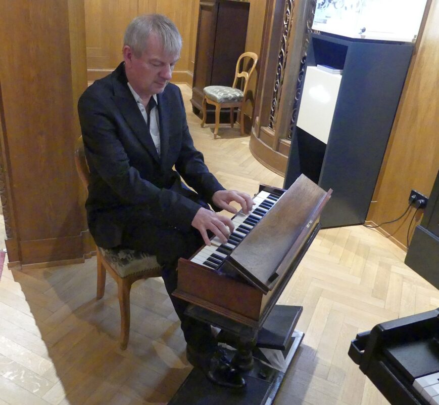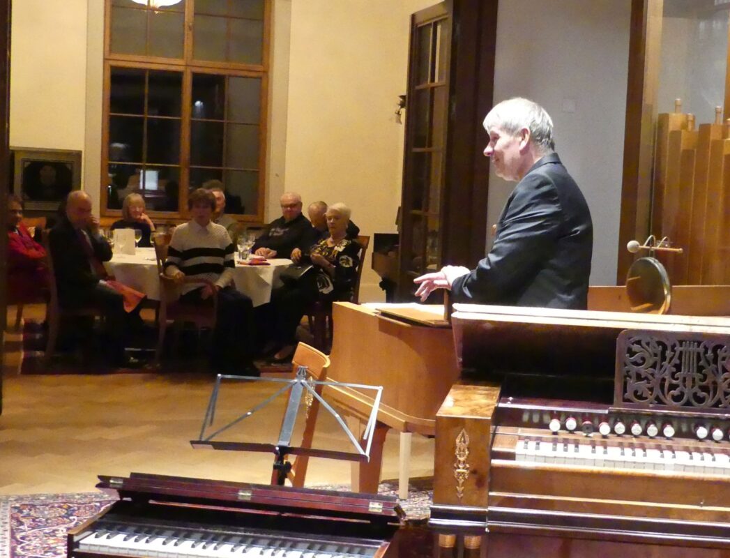 Nach einer Pause, bei der die Gäste gemeinsam mit den Musikern den ersten eines dreigängigen Menus genossen, lud Müller in den großen Salon. Dort stand ein Stück von Sigfrid Karg-Elert „im behaglichen Walzerzeitmaß“ auf dem Programm. Müller nannte den in Oberndorf geborenen Komponisten den „Rachmaninov des Harmoniums“.