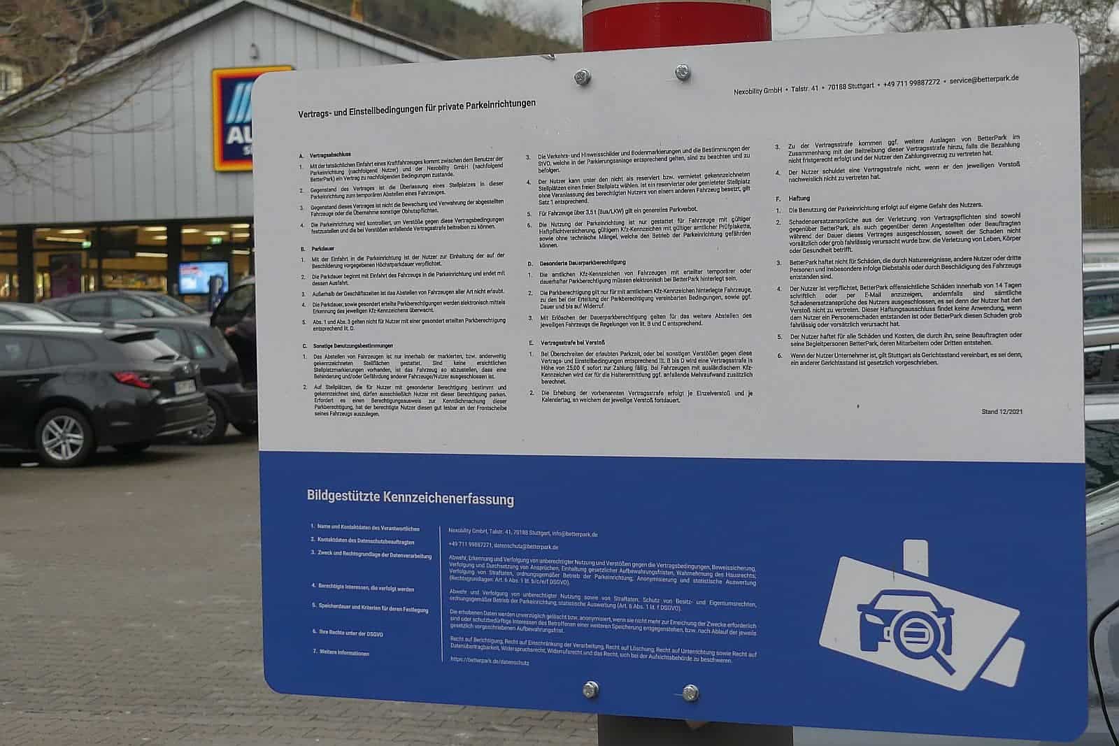 Auf dem Aldi-Parkplatz an der Bahnhofstraße gilt tatsächlich die Höchstparkdauer von einer Stunde. Überwachen lässt der Discounter diese Parkzeiten von einem externen Dienstleistungs-Unternehmen, der nexobility GmbH aus Stuttgart.