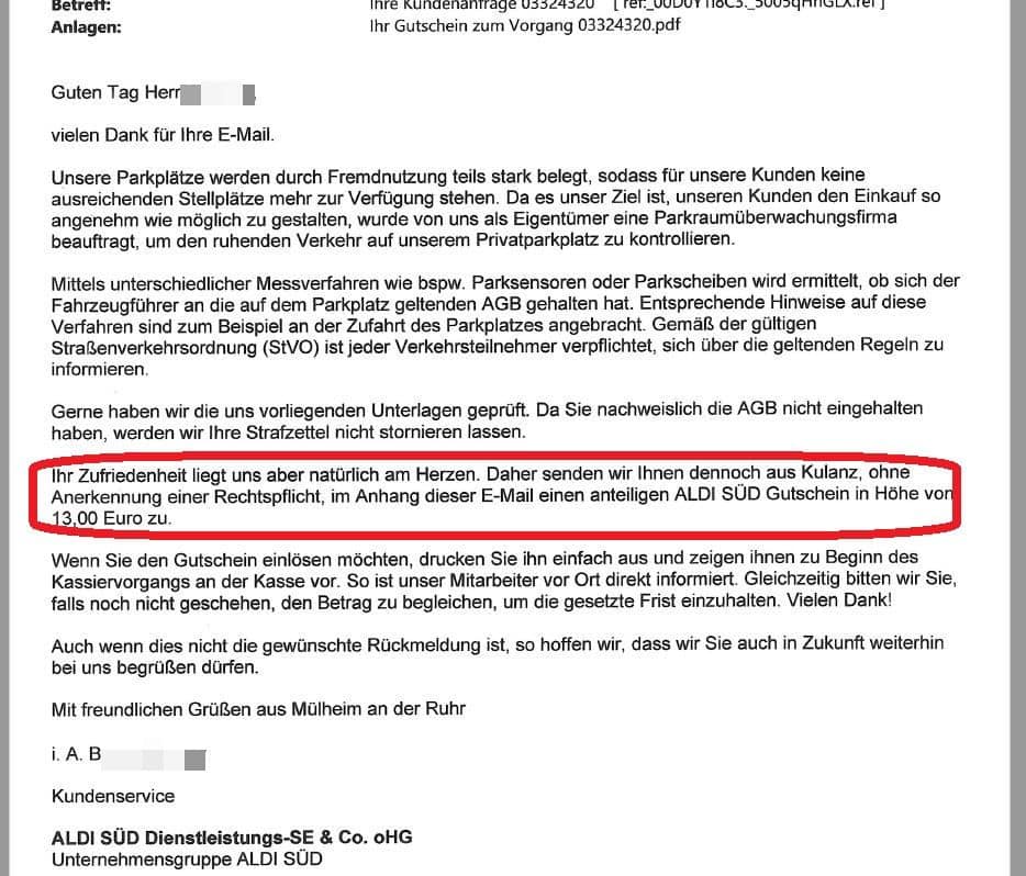 Und der Aldi-Kunde? Ihm sei schon klar, dass er die Strafe zahlen müsse, sagt er der NRWZ. Allerdings sieht er einen Widerspruch darin, dass Aldi ihm dennoch einen Gutschein anbietet. Ebenfalls mag er nicht verstehen, weshalb der Discounter die Parkzeit nicht, wie vom Marktleiter vor Ort gewünscht, auf anderthalb Stunden erhöhe. Seine Vermutung: „Hier verdient Aldi noch recht gut mit.“