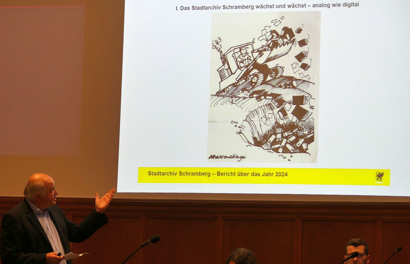 Schramberg. Ohne Erweiterungsmöglichkeiten könne das Stadtarchiv keine weiteren Akten und Objekte mehr annehmen, betonte er in seinem Bericht für das Jahr 2024. Mit einer Karikatur von Uwe Rettkowski aus vergangenen Zeiten dokumentierte er das Dilemma: Einerseits muss die Stadt ein Archiv haben, das sei eine gesetzlich geregelte Pflichtaufgabe. Andererseits seien inzwischen alle Lagerräume „definitiv voll“.