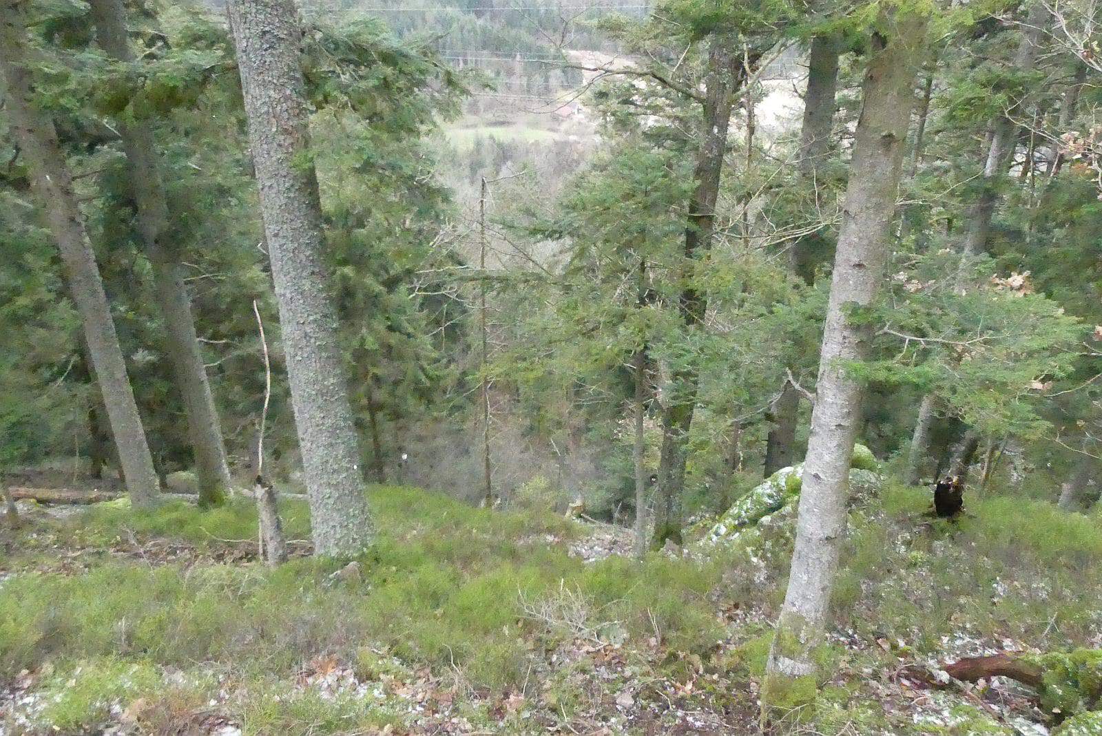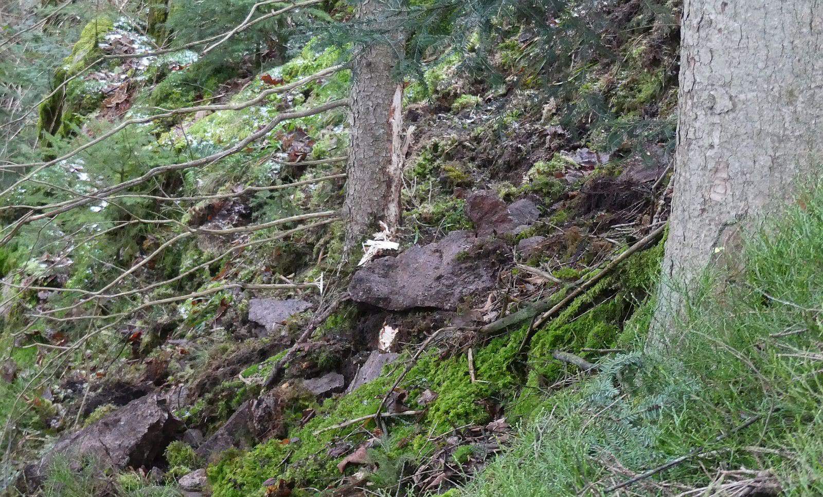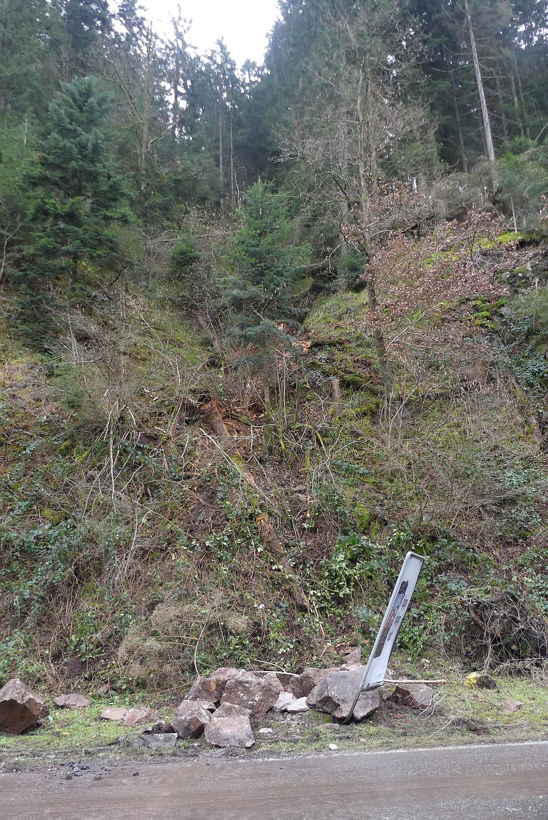 Oben im Wald sind die Spuren des Orkans Sabine deutlich zu sehen: Umgestürzte Bäume, herausgerissene Wurzelstöcke. An vielen Stellen auch lockeres Gestein, das nur wenig braucht, um den Steilhang hinunter zu krachen.