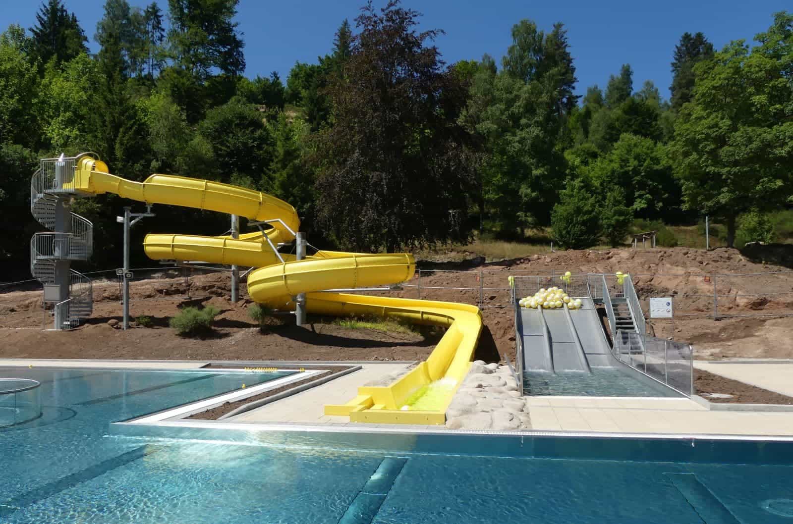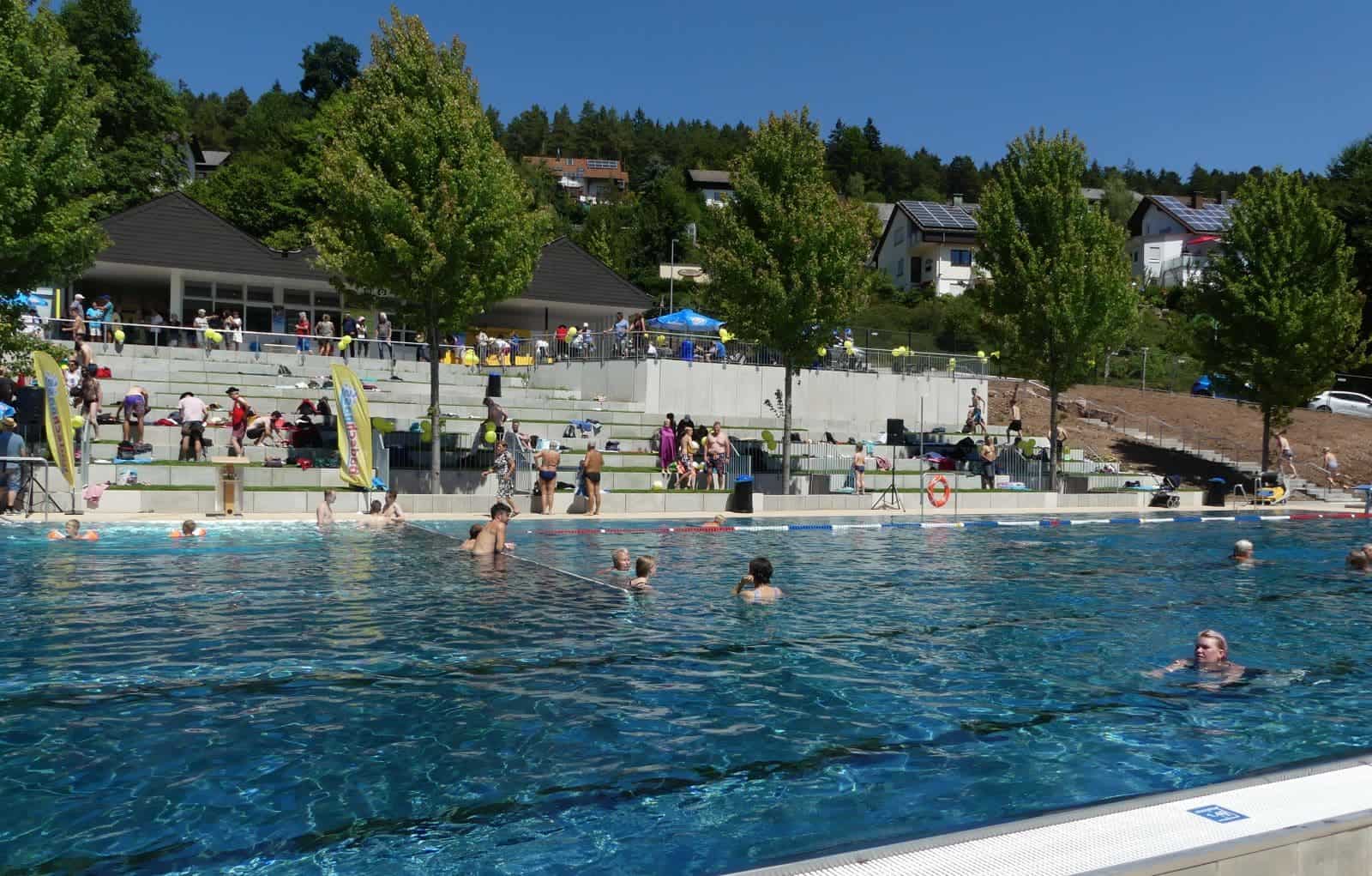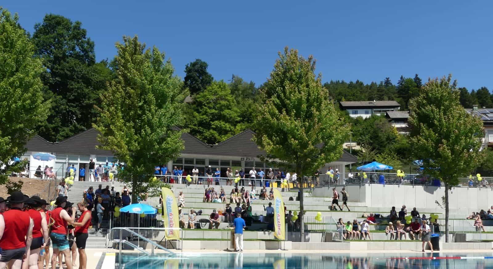 Schramberg – Mit Badnerlied, Badehos und Badeanzug eröffneten die Tennenbronner und Schramberger ihr neues Badschnass-Freibad. Nach Reden von OB Dorothee Eisenlohr und Stadtwerkeleiter Peter Kälble und Märschen der Musikerinnen und Musiker vom Frohsinn eröffneten Eisenlohr, Kälble und Tennenbronns Ortsvorsteher Manfred Moosmann mit einem Rutsch von der Breitwandrutsche das Bad.