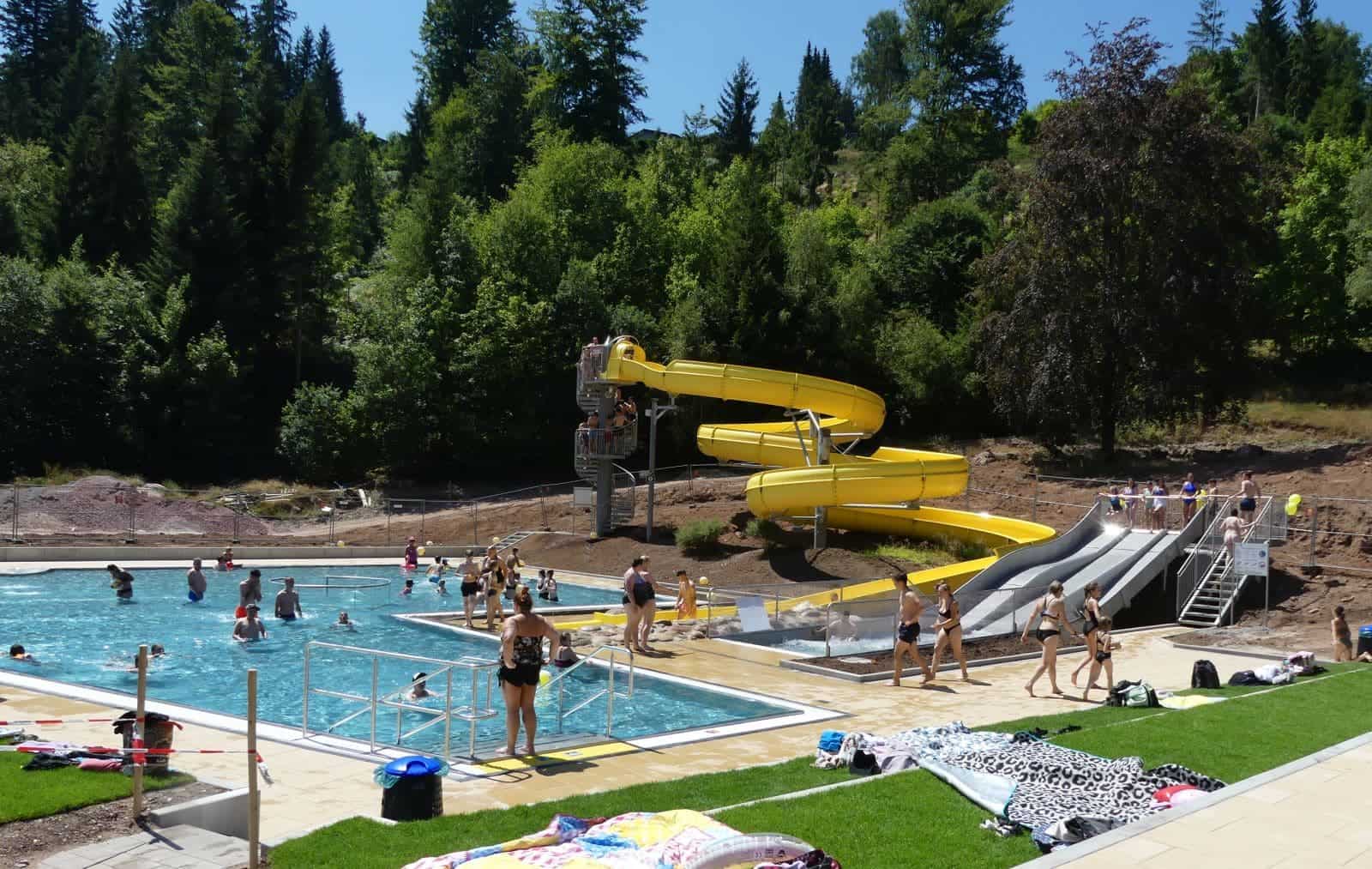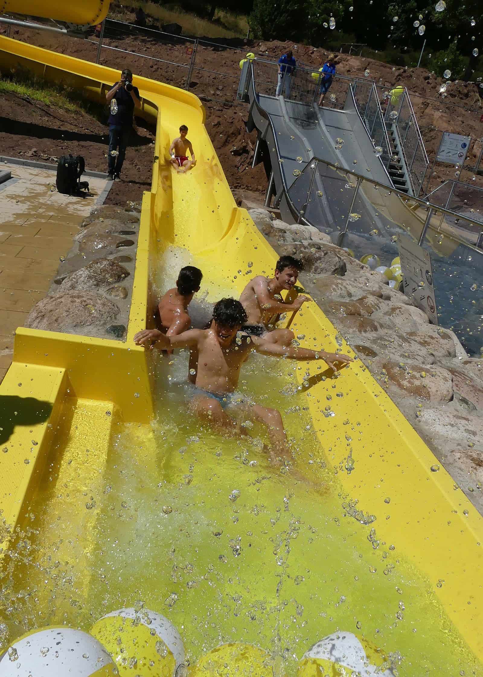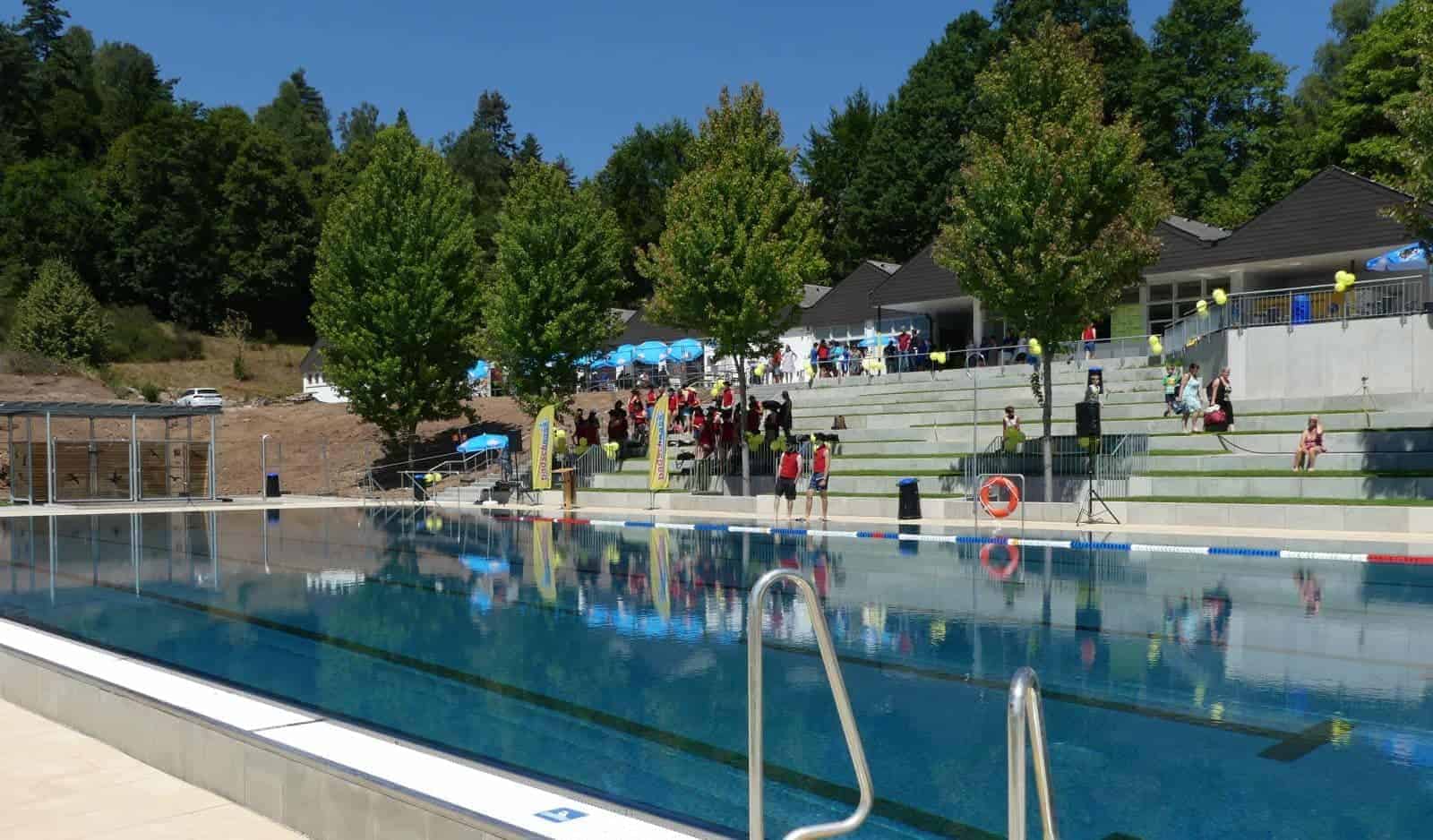 Schramberg – Mit Badnerlied, Badehos und Badeanzug eröffneten die Tennenbronner und Schramberger ihr neues Badschnass-Freibad. Nach Reden von OB Dorothee Eisenlohr und Stadtwerkeleiter Peter Kälble und Märschen der Musikerinnen und Musiker vom Frohsinn eröffneten Eisenlohr, Kälble und Tennenbronns Ortsvorsteher Manfred Moosmann mit einem Rutsch von der Breitwandrutsche das Bad.