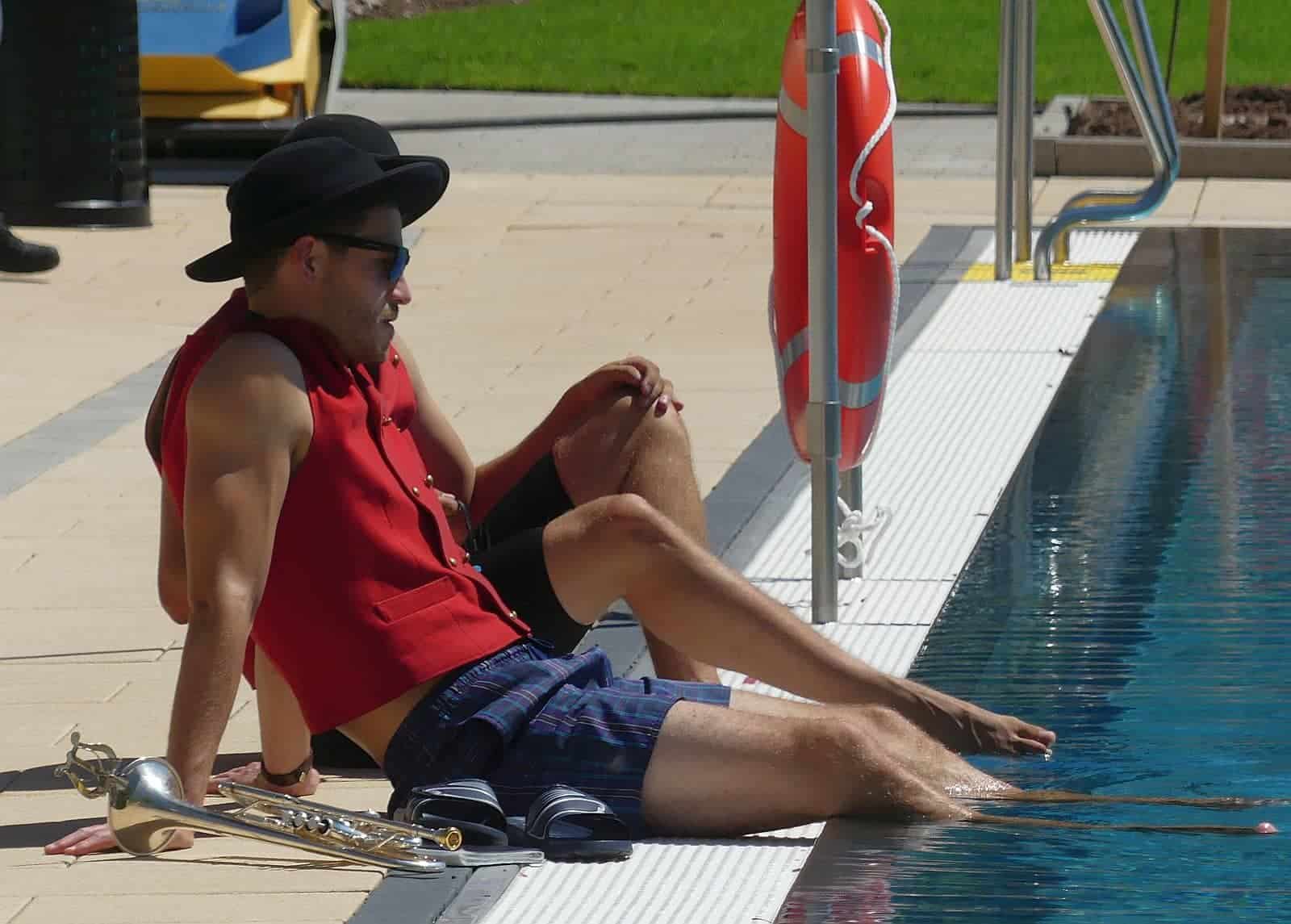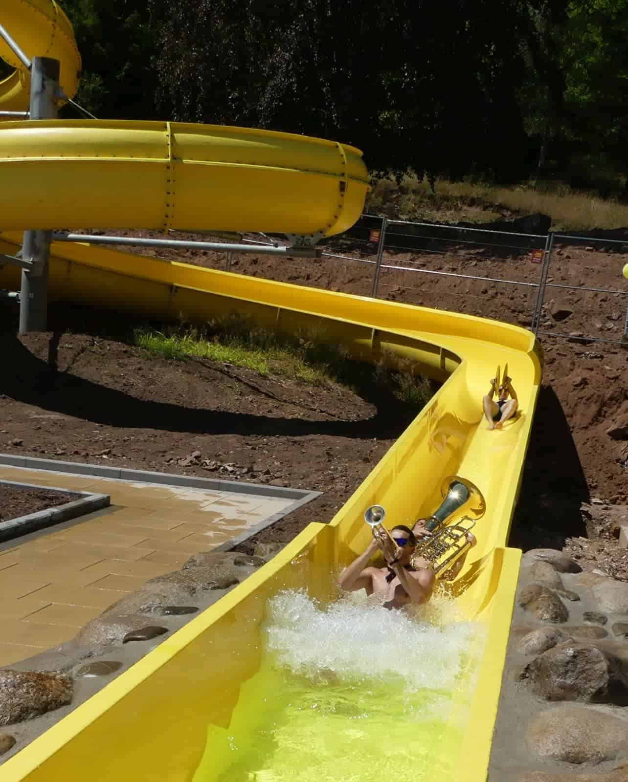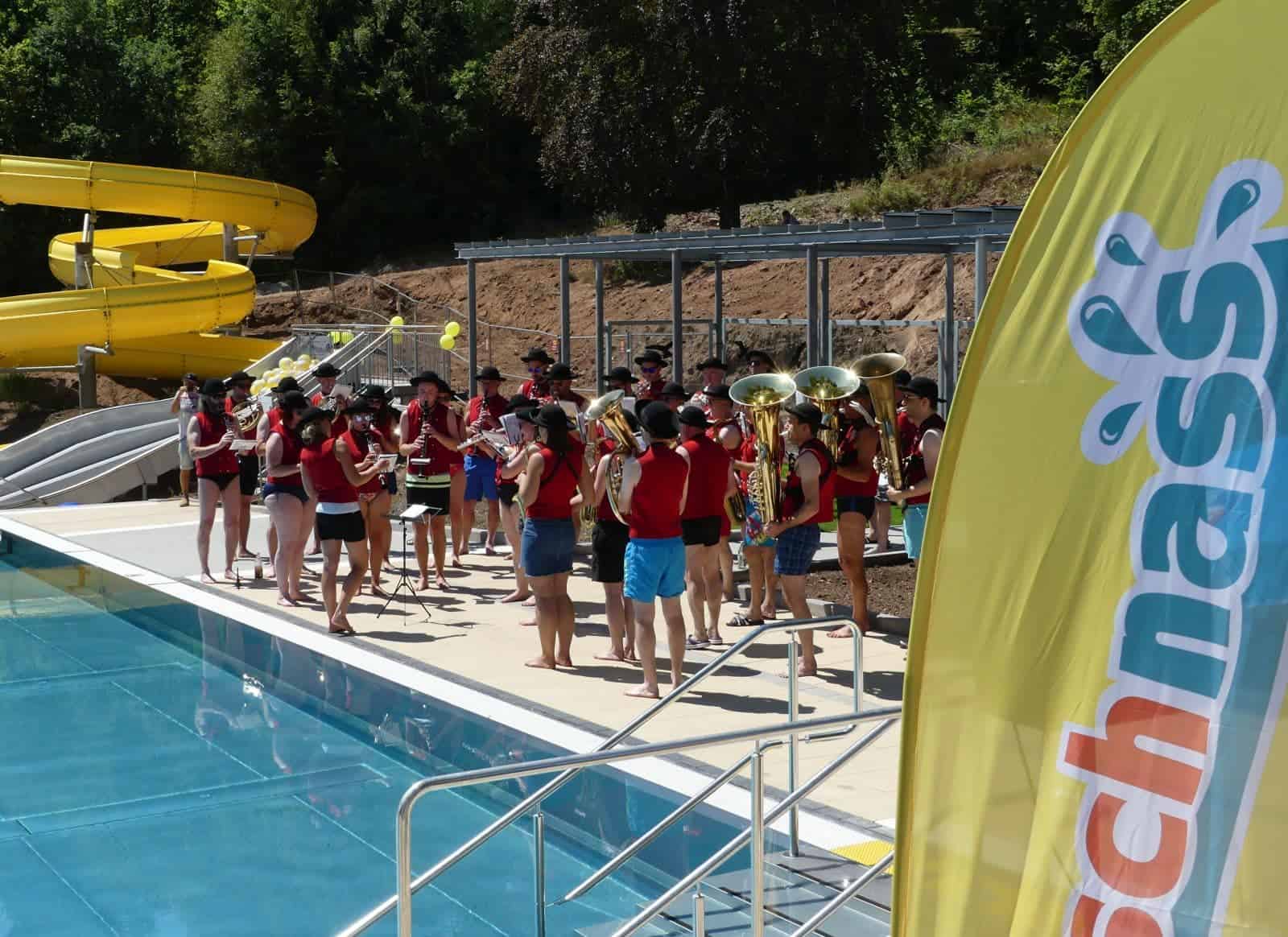 Nach einem weiteren Marsch, geblasen im Nicht-Schwimmbecken, eröffneten Eisenlohr, Moosmann und Kälble den Badbetrieb mit einem Rutsch ins neue Becken.