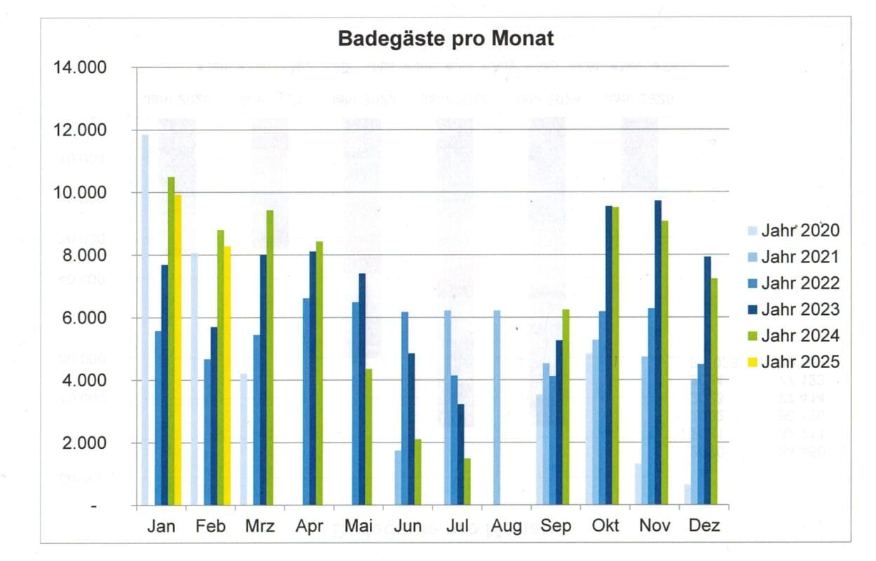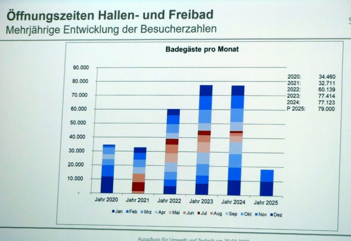 Anhand der Besucherstatistik zeigte Kälble, dass das Hallenbad Badschnass inzwischen wieder etwa 80.000 Besucherinnen und Besucher zählt. Die verringerten Öffnungszeiten im letzten Jahr hätten nur zu einem geringen Rückgang geführt. „Es hat sich nicht so bemerkbar gemacht, wie wir gefürchtet hatten.“