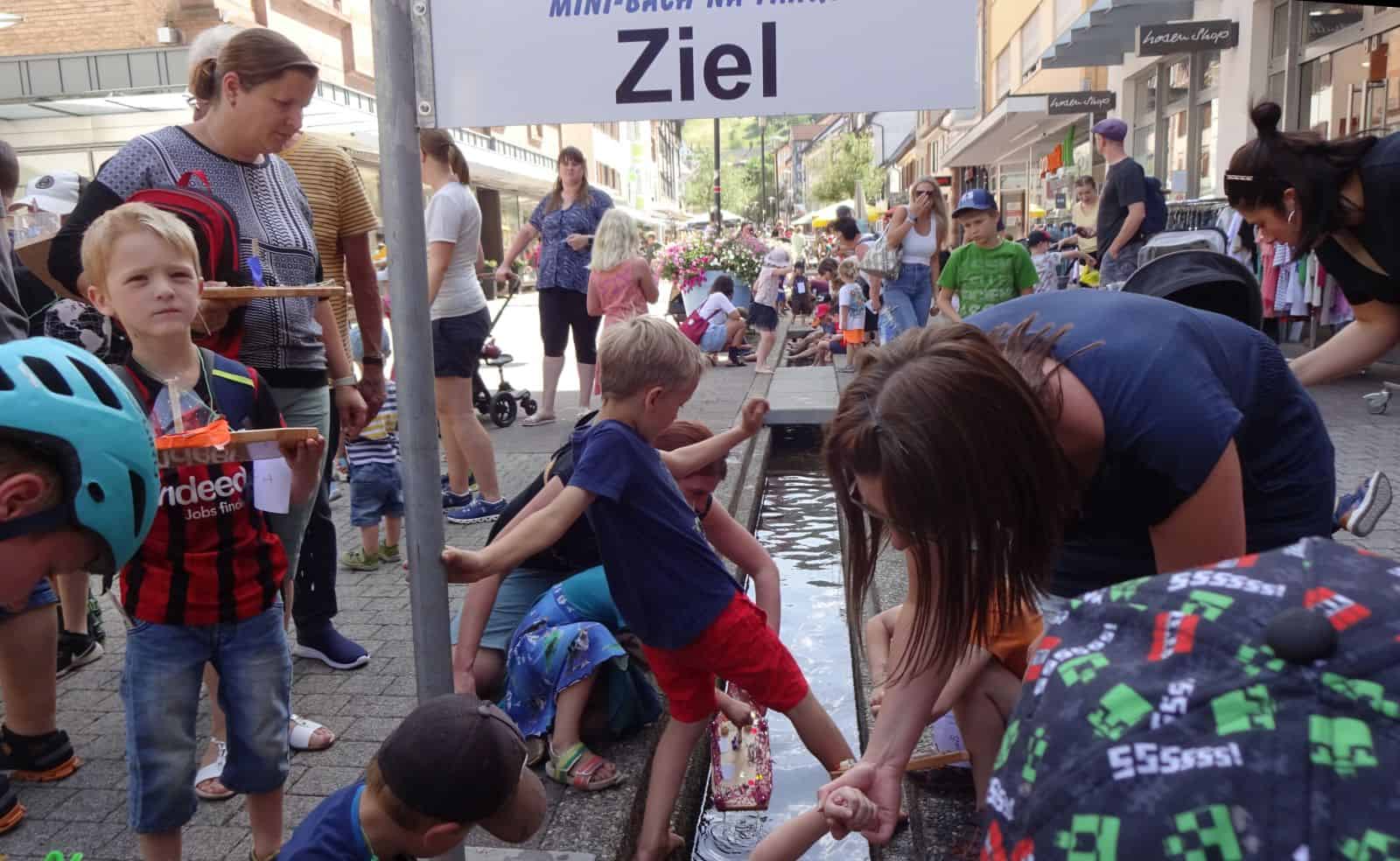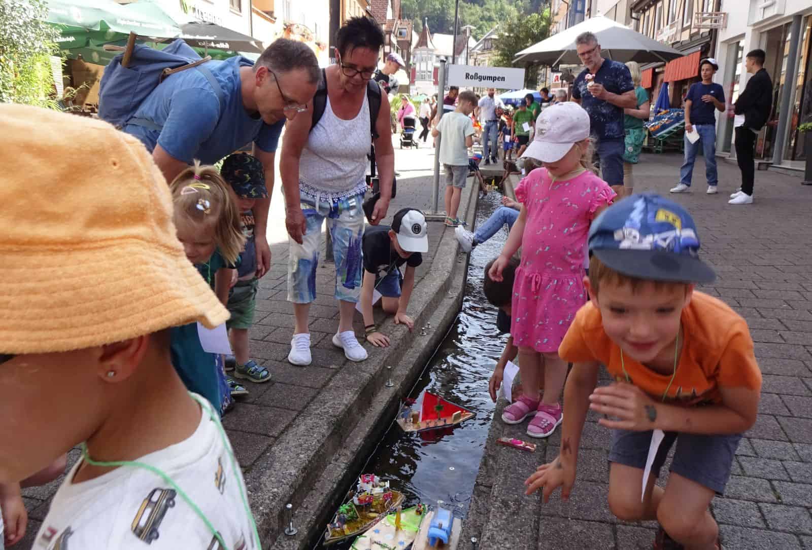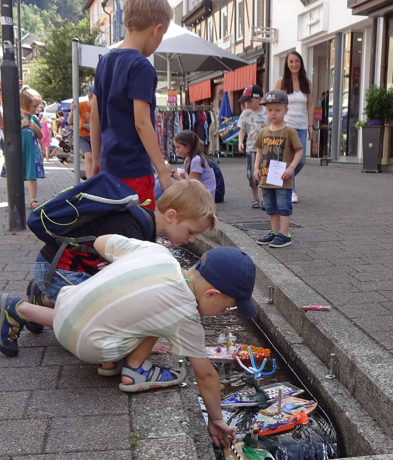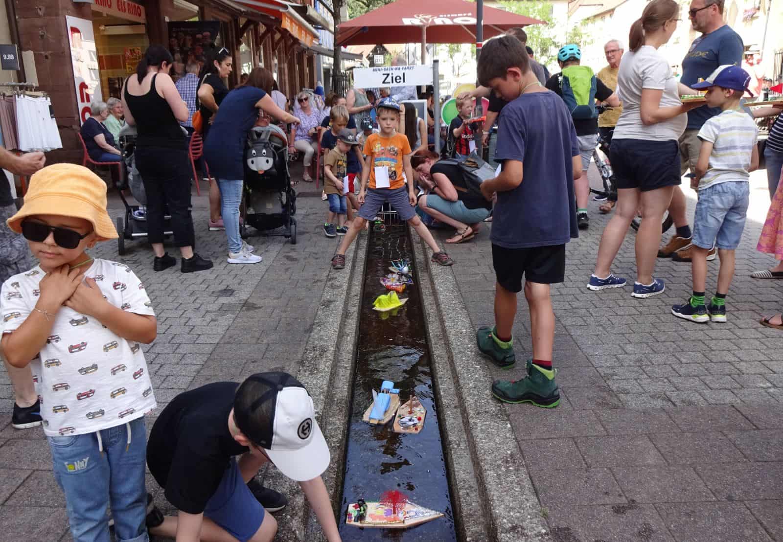 Am Narrenbrunnen begrüßte Bühler die Zuberkapitäne und Dorothee Eisenlohr, bevor die Kanalfahrt startete. In 10er Gruppen setzten die Kinder ihre Zuber ins Bächle und begleiteten sie durch die Hindernisse bis hinunter zum Ziel beim kleinen Rino.