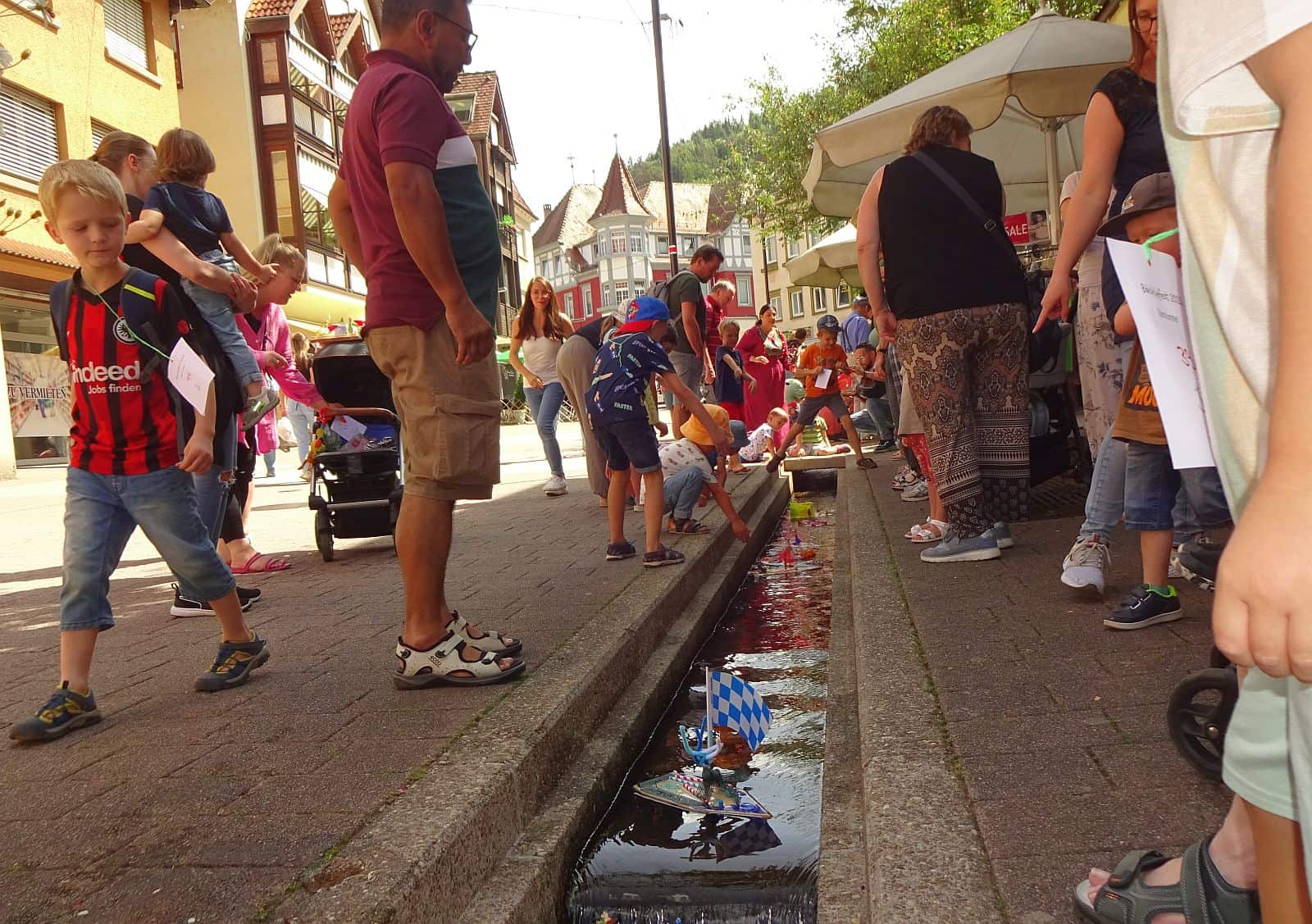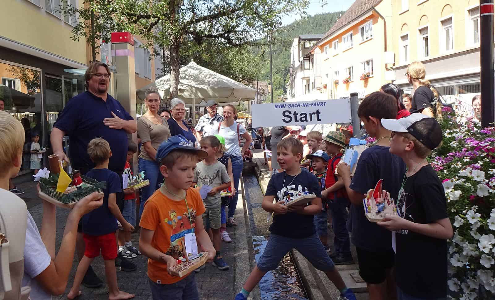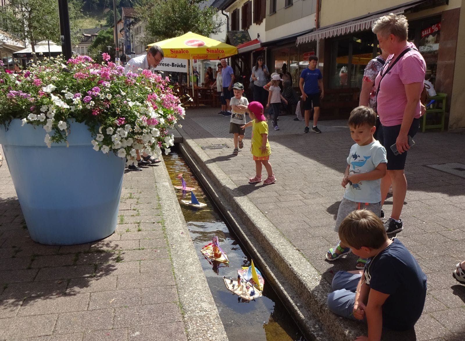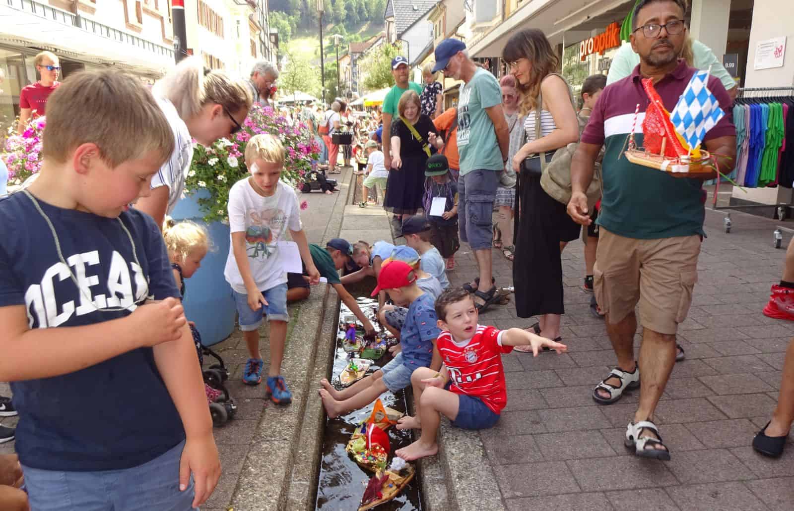 Am Narrenbrunnen begrüßte Bühler die Zuberkapitäne und Dorothee Eisenlohr, bevor die Kanalfahrt startete. In 10er Gruppen setzten die Kinder ihre Zuber ins Bächle und begleiteten sie durch die Hindernisse bis hinunter zum Ziel beim kleinen Rino.