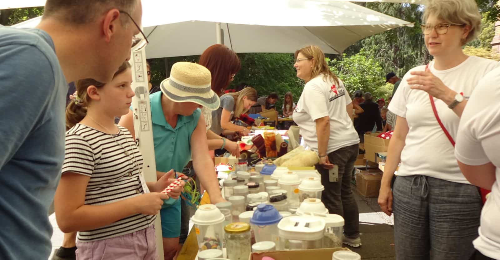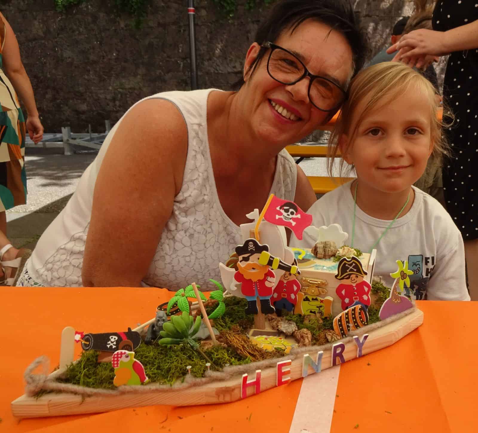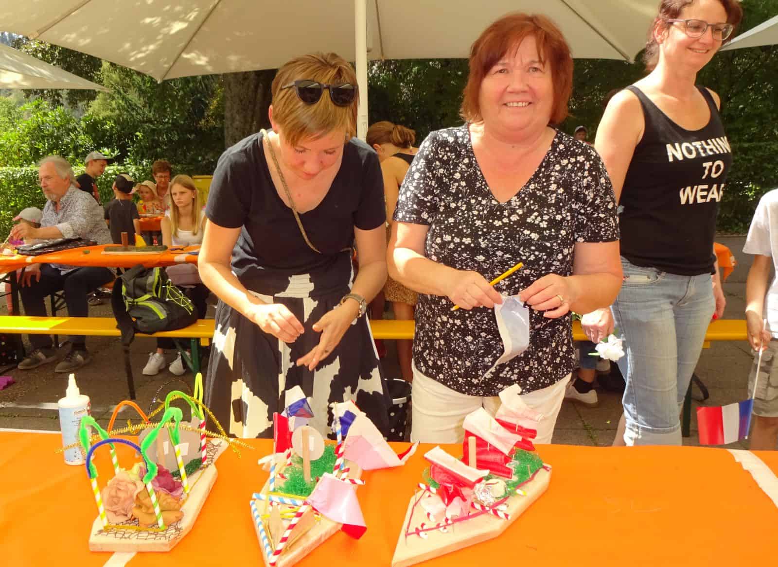 Bei bestem Bächlefestwetter bastelten zahlreiche Omas und Opas, Mamas und Papas mit und für ihre Zuberkapitäne und Kapitäninnen fantasie- und kunstvolle Zuber. Im Schatten der Sonnenschirme vor der Konzertmuschel bot der Handels- und gewerbeverein (HGV) viel Platz und unzählige Kisten mit Materialien, die verbaut und verklebt werden konnten.