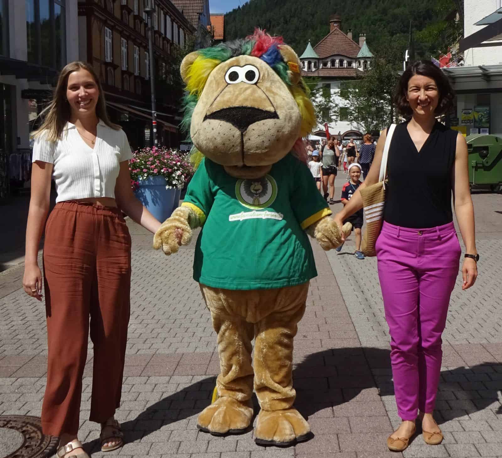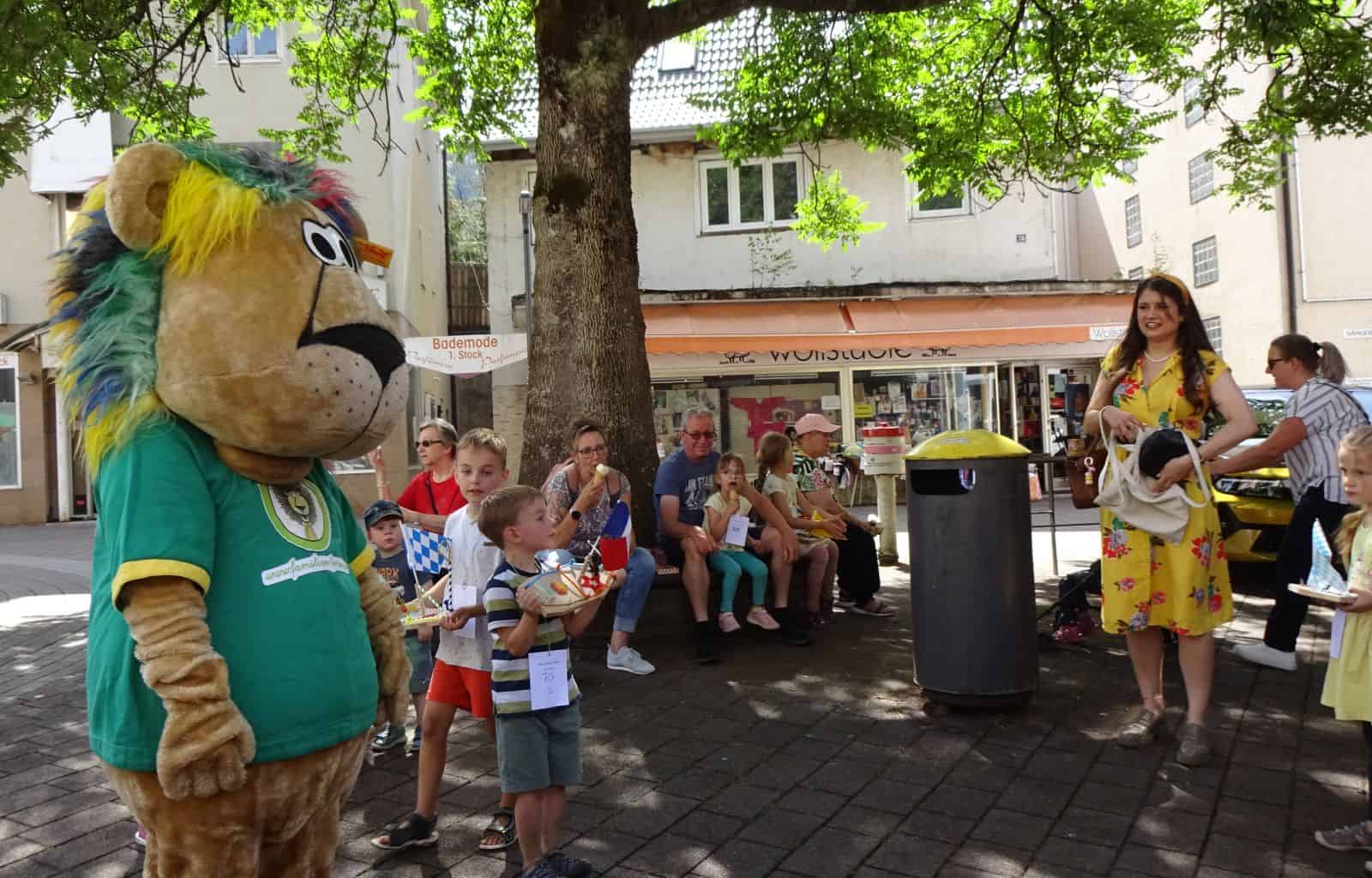Leo, das Maskottchen des Familienferienlands, war zu Besuch gekommen. Eine Azubine des Rathauses hatte sich freiwillig gemeldet und die schweißtreibende Aufgabe übernommen.